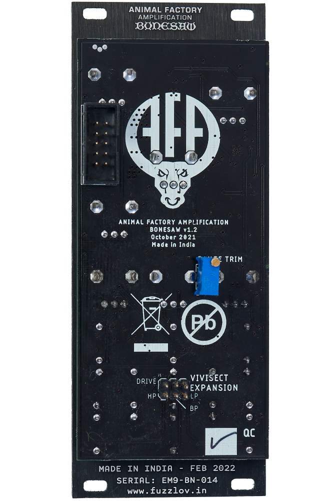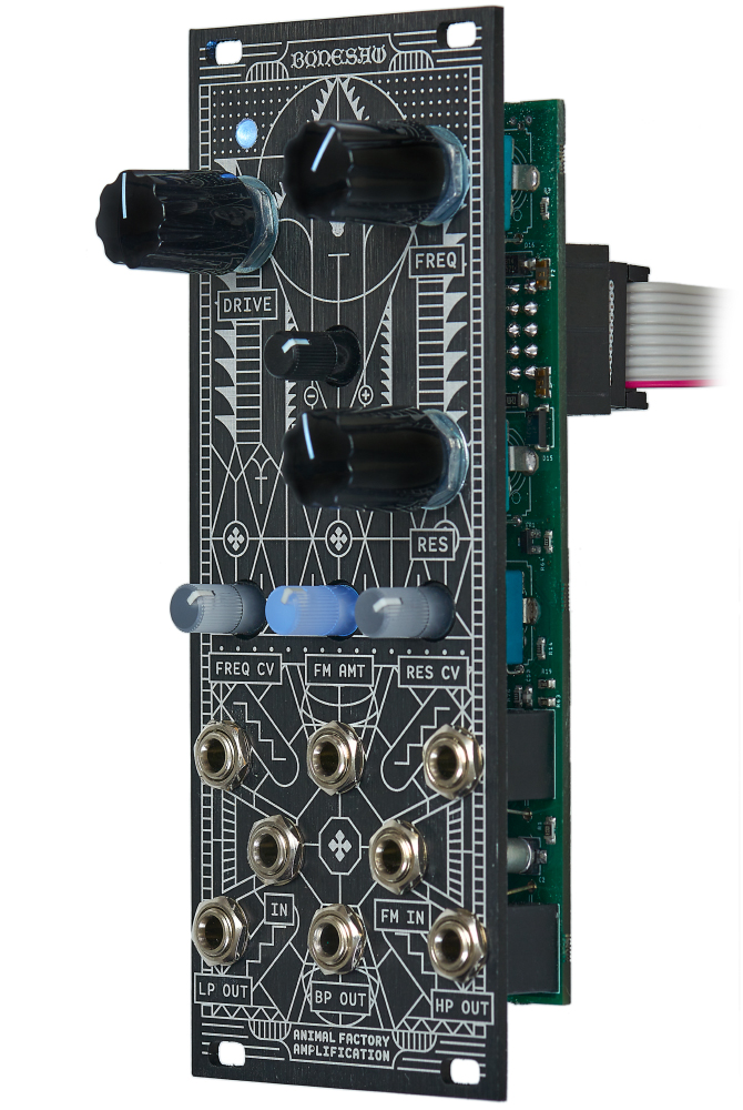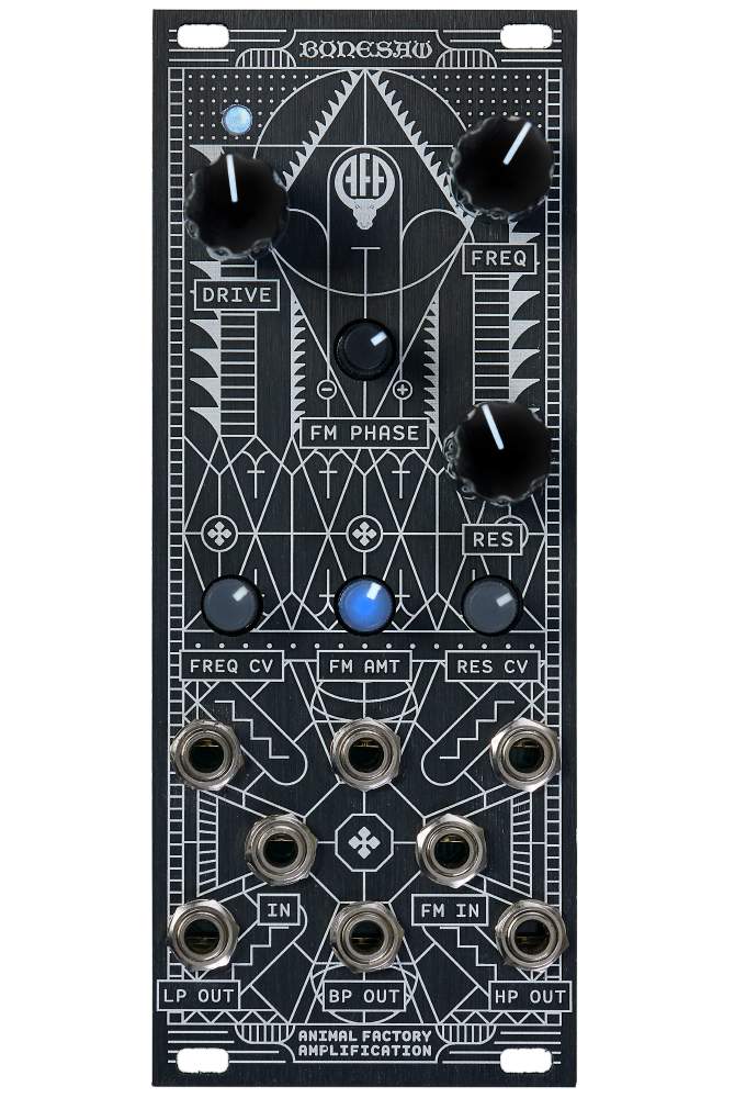 Bonesaw from Animal Factory Amplification is a filter with separate LP/BP/HP outputs. In addition, the module offers a drive circuit. The filter has a saturated fat sound and especially in lowpass mode it growls in the bass range, very mighty and powerful. Thanks to the FM input, very wild sounds can also be created.