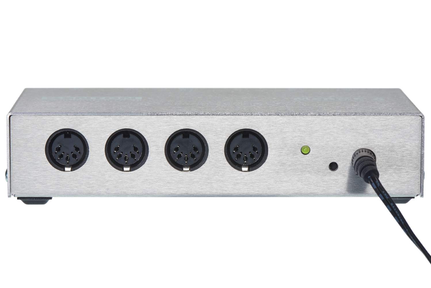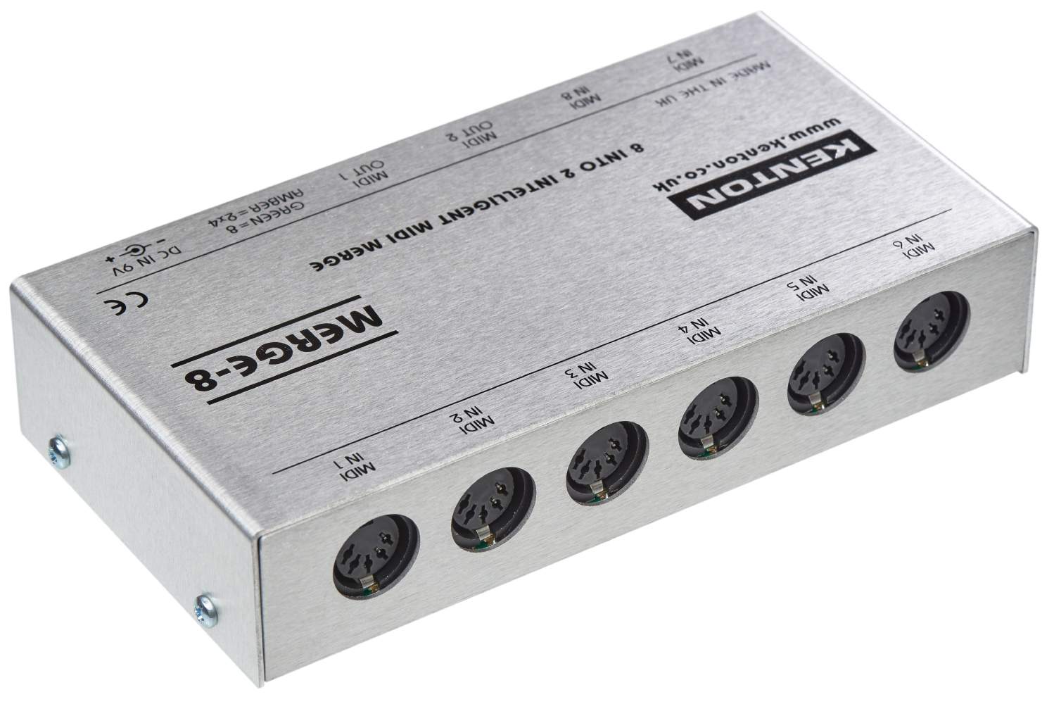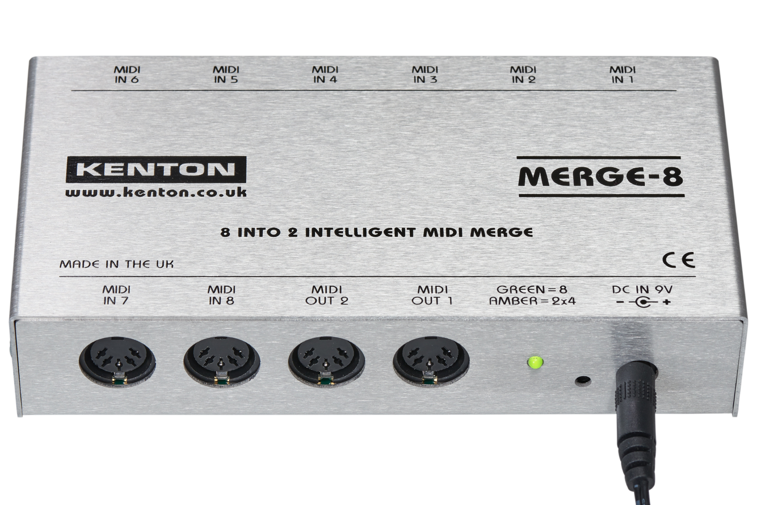 Merges the data from up to eight separate MIDI sources (e.g. master keyboards, controllers, computers etc.) into a single MIDI data stream which appears at both of the MIDI out sockets.