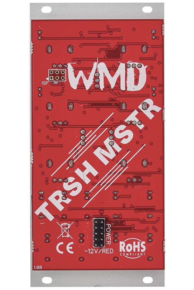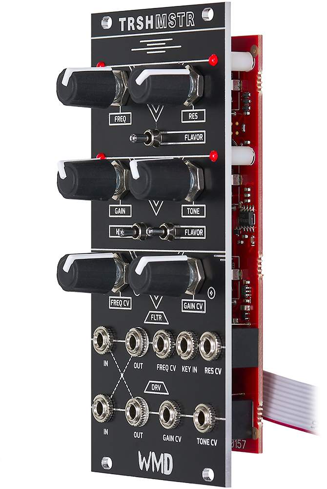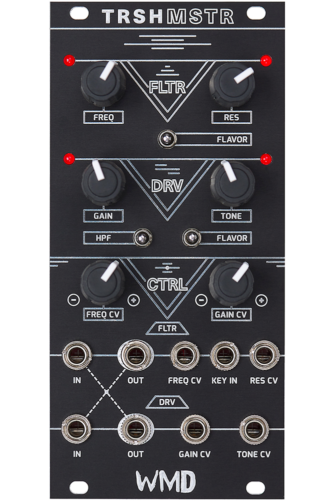 TRSHMSTR is a collaboration between WMD and electro dance heavyweights MSTRKRFT. TRSHMSTR features an aggressive combination of band-pass filtering (FLTR) and distortion (DRV). The FLTR and DRV sections can be used independently or together to create a wide range of tone shaping, from subtle distress to full-on acid destruction. The INs and OUTs of the FLTR and DRV sections are cross-normalled, so you can run your signal through FLTR and into DRV, or vice versa, without any extra patching.