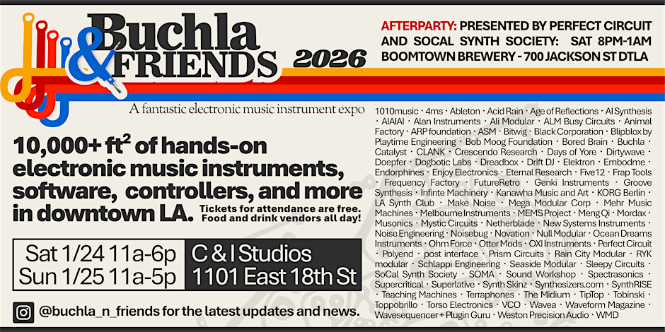 Now in its third year, Buchla & Friends runs alongside the NAMM show in Anaheim. With a strong focus on showcasing boutique synth makers, Buchla & Friends has grown year on year, and this year it expects over 80 brands to attend. We will be representing Animal Factory, Clank, Doepfer, Endorphines, Frap Tools, Ohm Force, Supercritical Synthesizers, Tobinski, Teaching Machines, and Verbos Electronics.