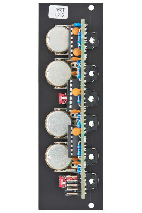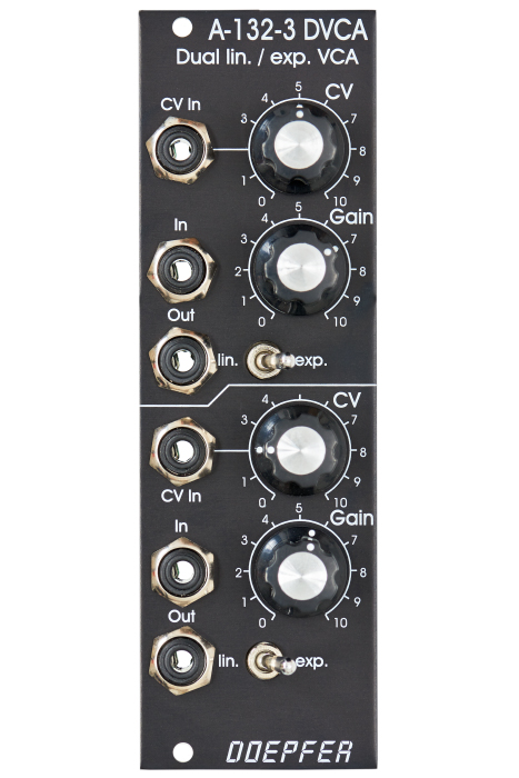 Each VCA has a manual gain control and a control voltage input with attenuator. The character of the control scale can be switched to linear or exponential. All inputs and outputs are DC coupled. Consequently the VCAs can be used to process both audio and control voltages.