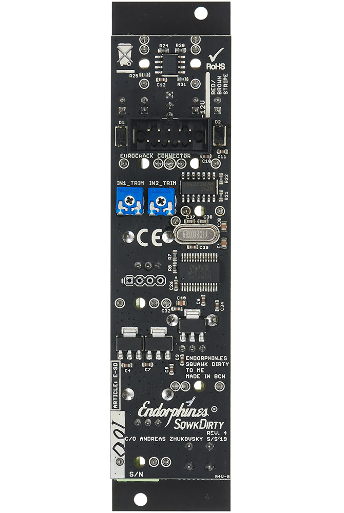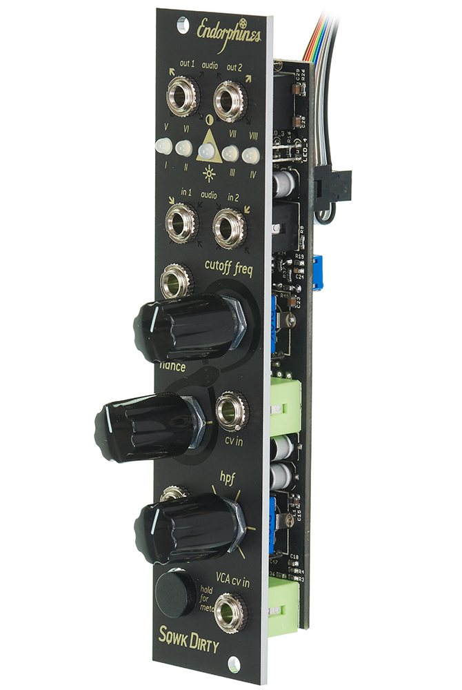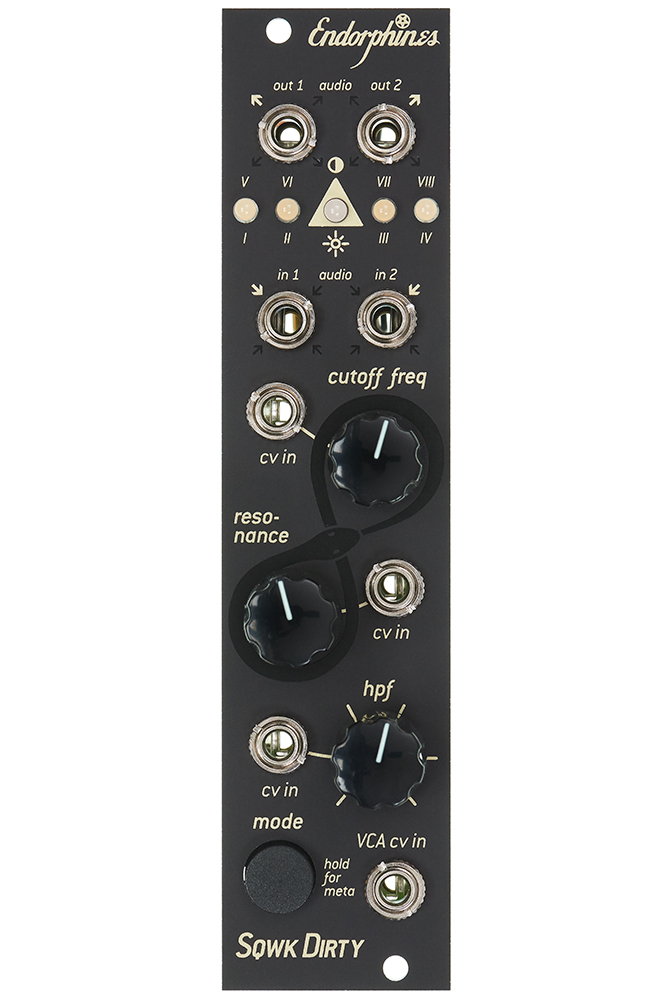 The Squawk Dirty To Me is a stereo filter with voltage controlled resonance. It features 8 filter modes and zero-delay feedback.