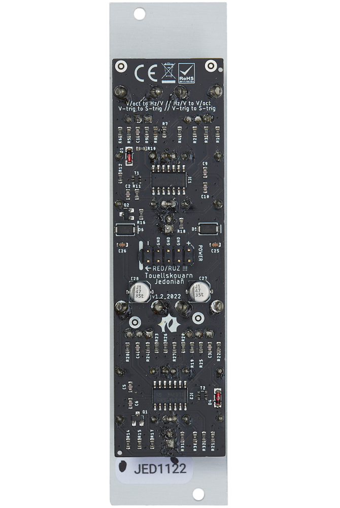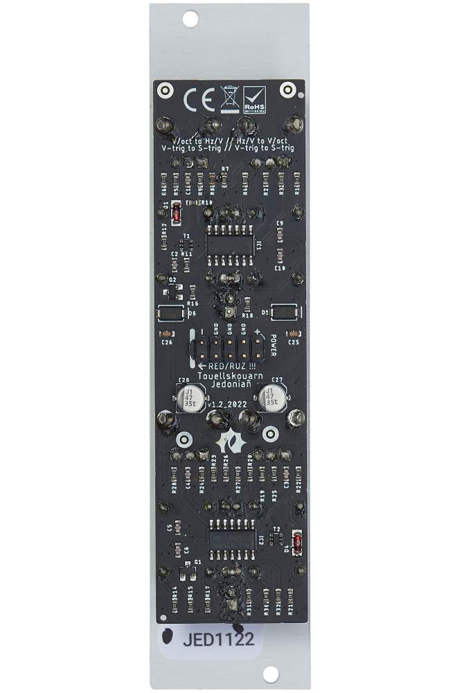 The Touellskouarn Jedonian is a bidirectional Hz/V converter. It allows to convert S-Trig to V-Trig and back, and to convert V/Oct to Hz/V and vice versa. The Hz/V standard works with Korg MS and old Yamaha CS among others.