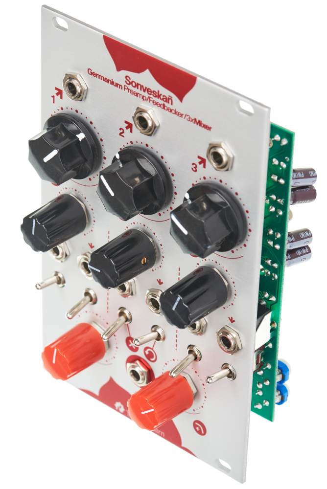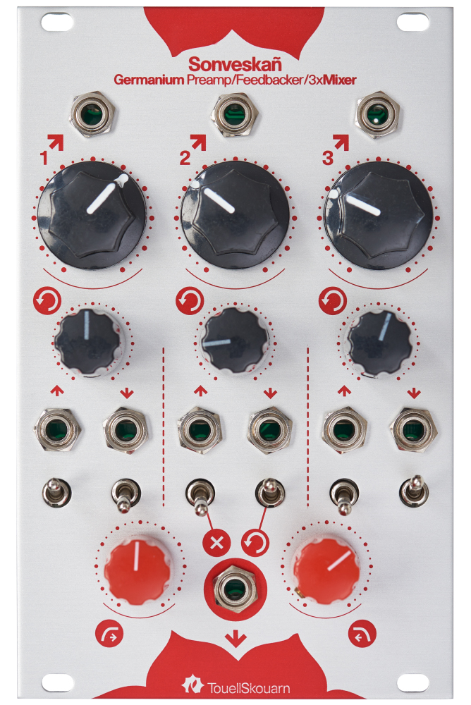 The TouellSkouarn Sonveskan is a three-channel mixer, which features a dual gain stage, voltage controlled feedback, mute and a direct outputs per channel.
