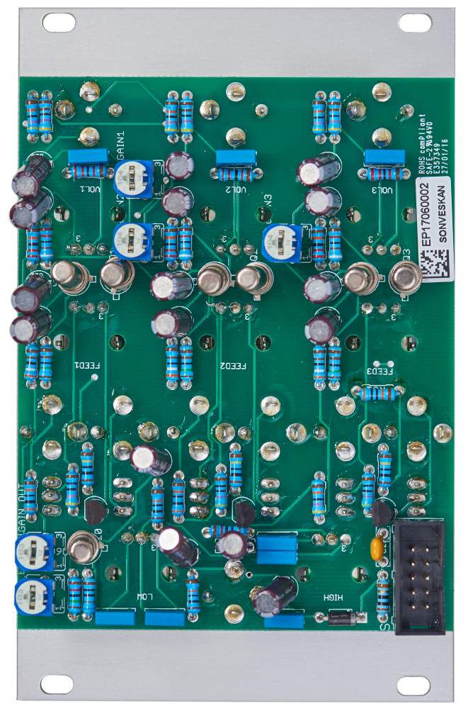 The Sonevskan uses geramnium transistors for the amplification, fans of distortion and feedback will be very pleased with this module. Each channel has a signal input with a level control which for sure adds some germanuim transistor distortion. De facto the signal passes not one but two gain stages. The gain fo the second one can be adjusted to your desires by a trimmer on the circuit board. The pre-amplified signal is available at an unbuffered direct output. Below the gain control there's a control which determines the amount of feedback, or if a feedback CV is used it acts as a modulation amount controller. The feedback can be switched off immediately with a swithc and another switch mutes the channel. Because of the direct outputs you can use each channel as an individual distortion/preamp. The three channels are mixed and then are processed by an EQ featuring potentiometers for low and high frequencies. The processed signal is available at the mix output.