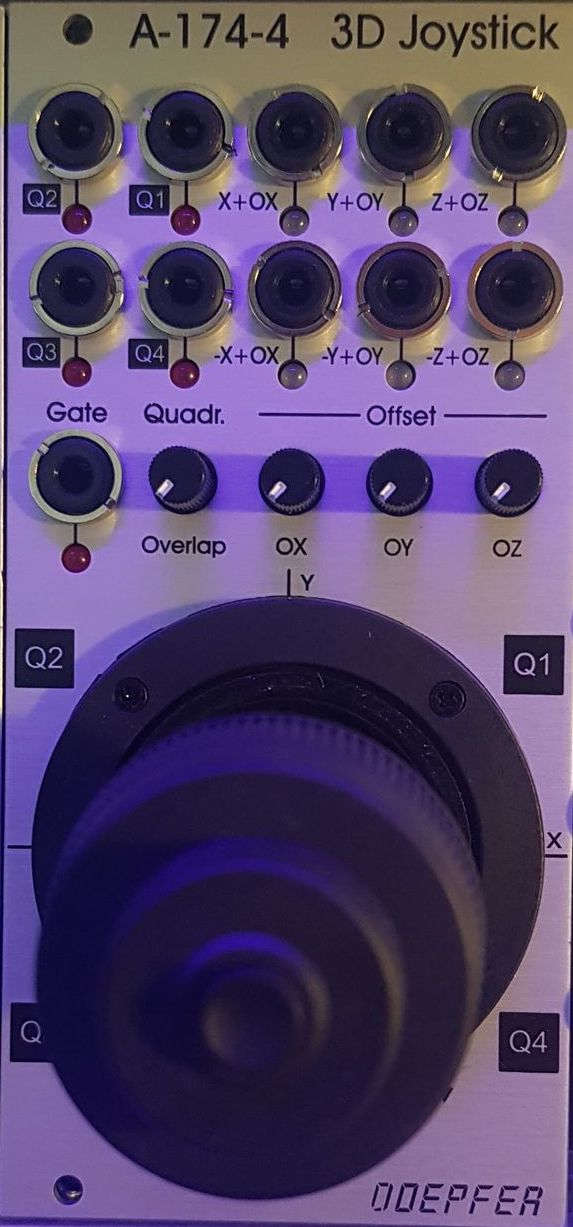 Das Modul gibt drei Steuerspannungen, die von einem federbelasteten X/Y-Kreuzpotentiometer (sog. Joystick) erzeugt werden, und ein Gate-Signal aus. Die Steuerspannungen für X und Y werden in gewohnter Weise durch die X- und Y-Position des Joysticks gesteuert. Die dritte Steuerspannung Z wird durch die Drehung des federbelasteten Joystickknopfes gesteuert. Das Gate-Signal wird durch eine Taste in der Mitte/oben auf dem Joystickknopf erzeugt.