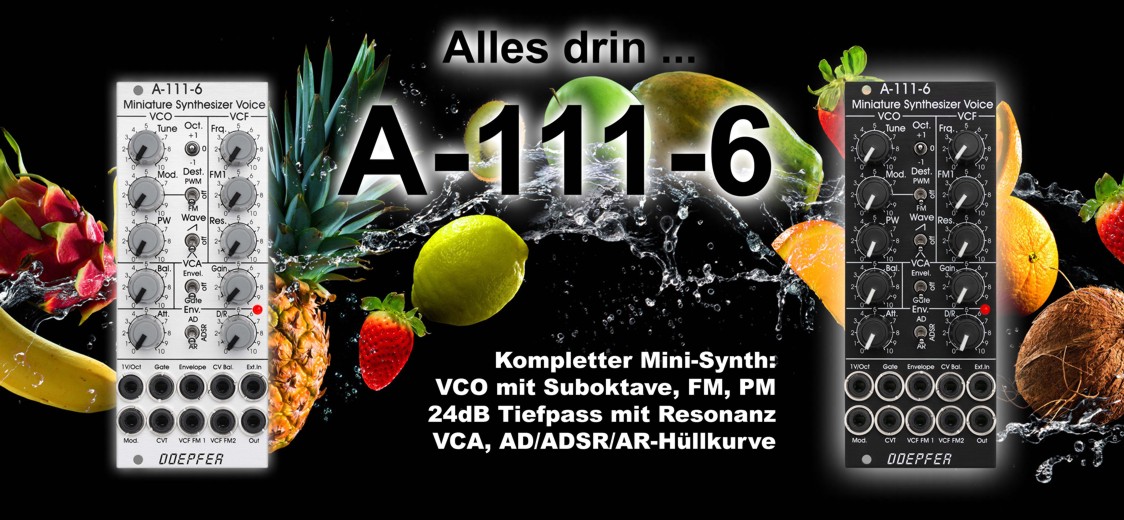 Das Doepfer A-111-6 beinhaltet einen kompletten, monophonen Synthesizer mit einem Oszillator, einem -24dB Tiefpass Filter, einem VCA und einem spannungssteuerbarer Hüllkurven-Generator. Die Synthesizer-Stimme ist intern vorgepatcht, so, dass man nur CV und Gate verbinden muss um loslegen zu können. Der VCO bietet Sägezahn, Dreieck und Rechteck mit Pulsbreitenmodulation. Zusätzlich erlaubt der Balance Regler einen Suboszillator oder externen Eingang dazuzumischen. Diese Stimme bietet trotz der geringen Größe viele Optionen und einen kraftvollen Klang!