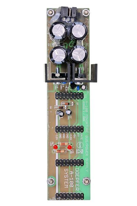 Mini-Netzteil/Busplatine OHNE Trafo Fertig aufgebautes und geprüftes Modul, +/-12V @ 200mA und +5V @ 50mA, integrierte Busplatine mit 4 Steckplätzen, speziell für Anwendungen mit nur einem oder wenigen Modulen (max. 200mA, max. 4 Module), benötigt 9V / 500mA Wechselstrom (AC, nicht DC),