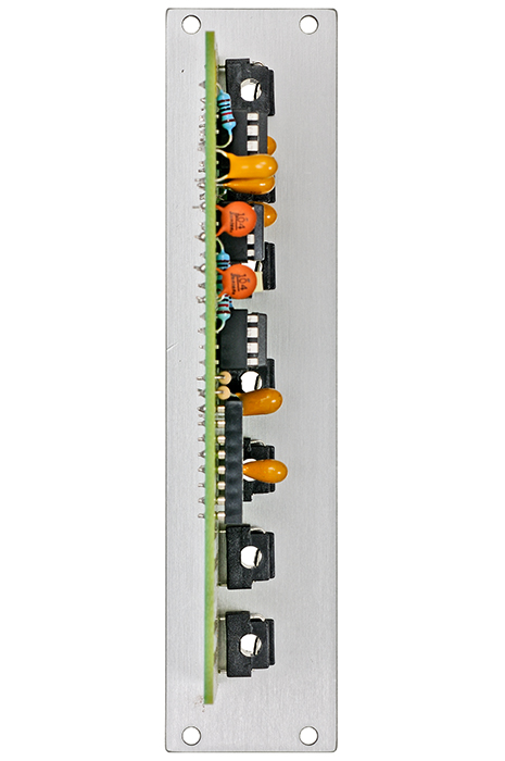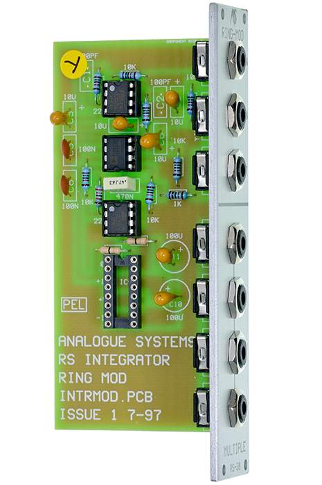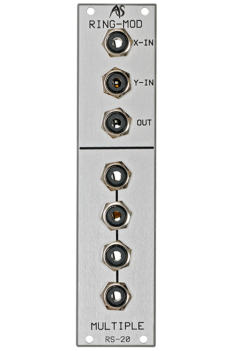 Dieses Modul enthält einen hochqualitativen Ringmodulator und ein praktisches 1x4 Multiples. AC-gekoppelter Ringmodulator, der auf dem AD633-IC aufgebaut ist. Die Originalfrequenzen werden unterdrückt, man hört ein Signal mit der Summe der Frequenzen (X+Y) und der Differenz (X-Y). Der Ringmodulator arbeitet sehr sauber. Ist nur ein Signal angeschlossen, so hört man am Ausgang nichts, das ist nicht bei jedem Ringmodulator der Fall und meist hört man ein Übersprechen.