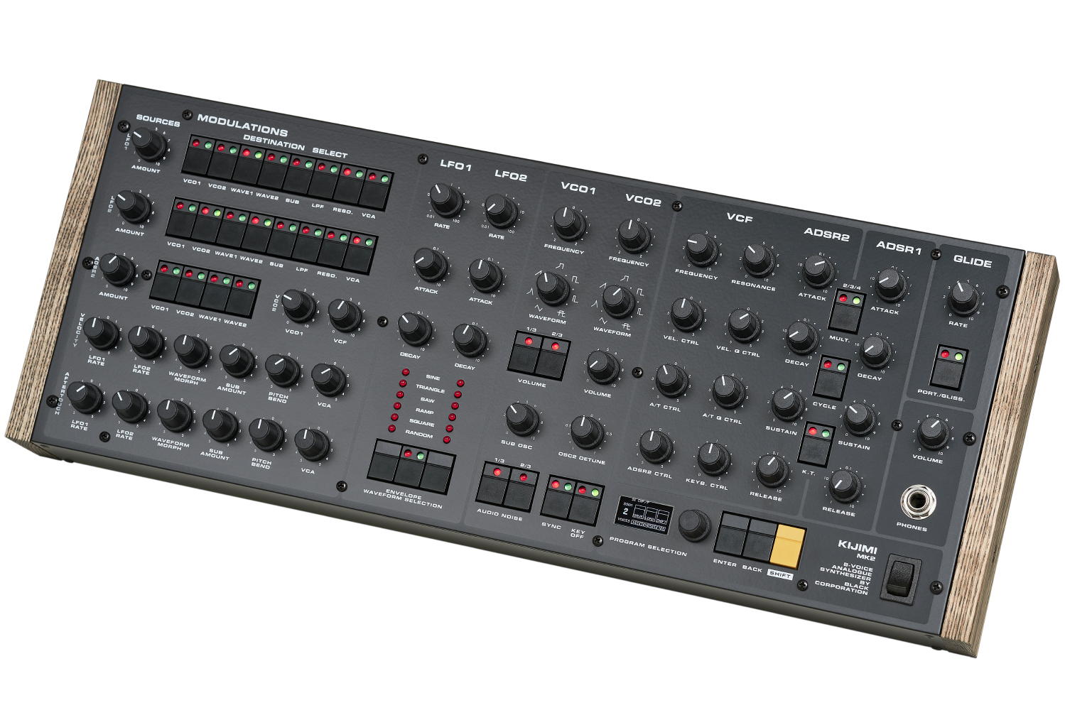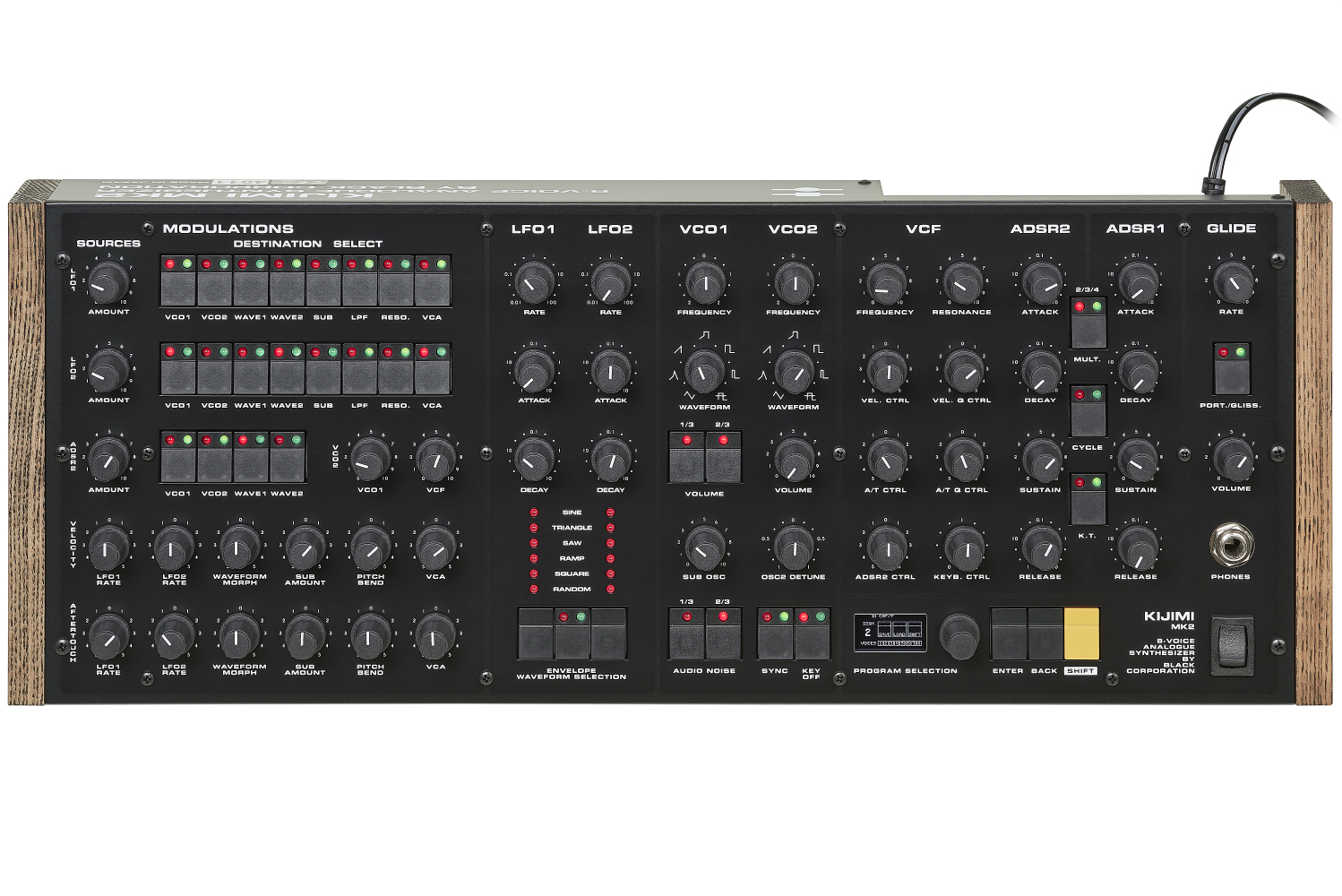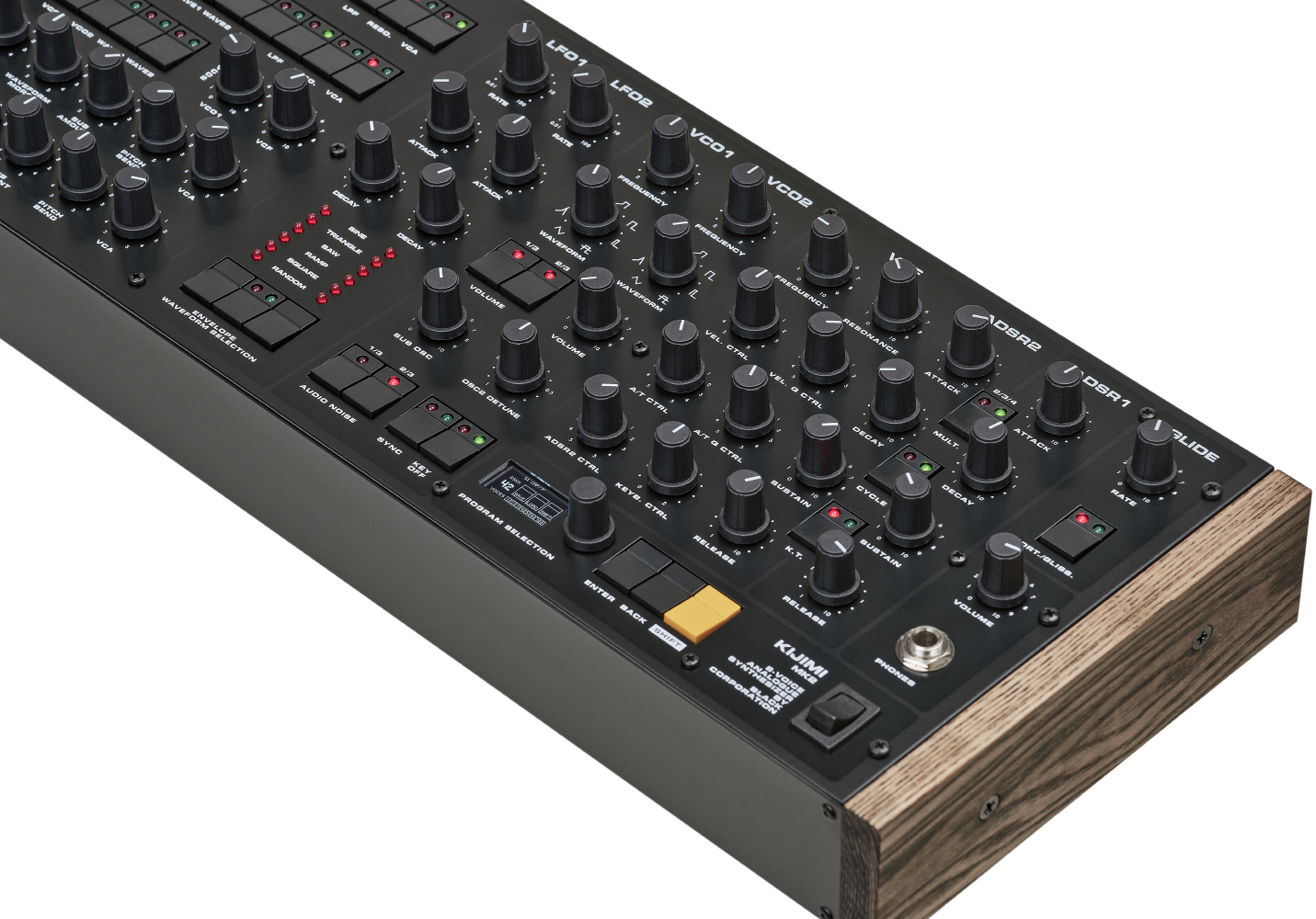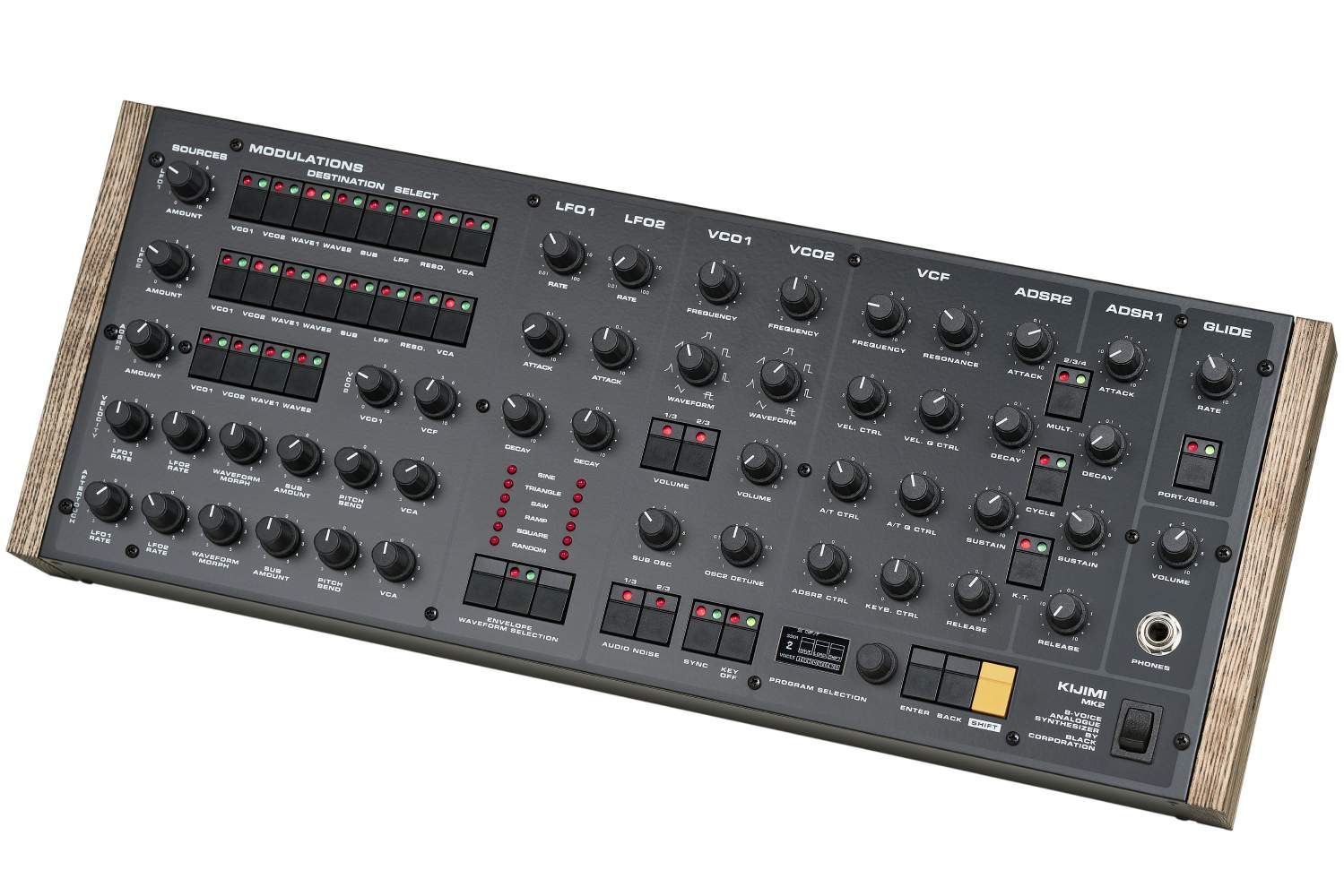 Kijmi Mk2 ist ein 8-stimmiger polyphoner Synthesizer mit zwei stufenlos regelbaren Oszillatoren (mit je einem Suboszillator) pro Stimme. Er verfügt außerdem über eine umfangreiche Modulationssektion, MPE-Kompatibilität und Preset-Speicher. Die VCOs können stufenlos durch Wellenformen morphen. Auch eine Rauschquelle ist vorhanden!