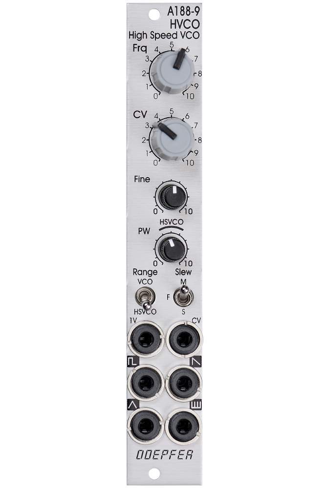 Das Modul A-188-9 ist ein sog. High-Speed-VCO, der im Bereich von ca. 15 kHz bis 500 kHz oktavrein arbeitet. Die Hauptanwendung ist die Ansteuerung von Eimerketten-Modulen (A-188-1/2), um diese über einen weiten Bereich oktavrein betreiben zu können (Stichwort: Karplus-Strong-Synthese). Aber auch in Verbindung mit anderen Modulen, die über Hochfrequenz-Eingänge verfügen (z.B. Digital Noise, Delay, Frequenzteiler) kann der A-188-9 zum Einsatz kommen.