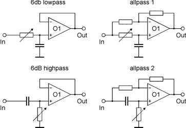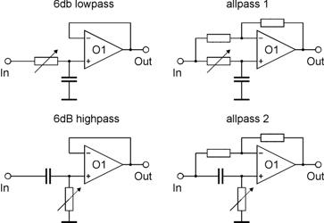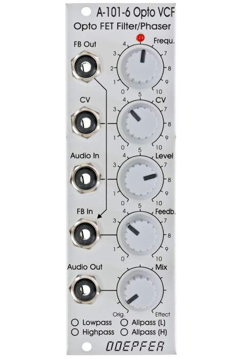 Das Modul A-101-6 besteht aus 6 seriell geschalteten 6dB-Filterstufen, wobei jede Stufe wahlweise als Tiefpass, Hochpass oder einer von zwei Allpass-Typen arbeiten kann.