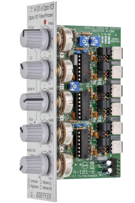A-101-6 ist ein Filtermodul, bei dem sogenannte "Opto-FETs" zur Steuerung der Frequenz verwendet werden. Opto-Fets sind ähnlich aufgebaut wie Vactrols, jedoch kommen hier lichtempfindliche Feldeffekt-Transistoren (FET) statt lichtempfindlicher Widerstände (LDRs) zum Einsatz. Bei Opto-FETs sind ein lichtempfindlicher FET und eine Leuchtdiode in einem gemeinsamen, lichtdichten Gehäuse untergebracht. Der Vorteil gegenüber Vactrols besteht darin, dass Opto-FETs wesentlich schneller sind als LDRs und somit auch sehr kurze Attacks/Decays oder FM-Effekte möglich sind. Der Nachteil besteht darin, dass sich ein FET nur bei geringer Aussteuerung wie ein ohmscher Widerstand verhält. Bei höherer Aussteuerung nehmen die Verzerrungen zu. Ansonsten gelten die gleichen Hinweise wie bei den Vactrol-Grundlagenerwähnt.