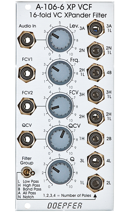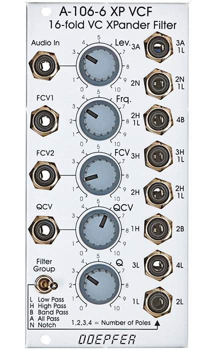 Das Modul A-106-6 ist ein Multimode-Filter, in dem die Schaltung des Oberheim Xpander zum Einsatz kommt. Das Modul verfügt über 15 verschiedene Filtertypen wobei 8 Filter gleichzeitig zur Verfügung stehen und mit Hilfe des Kippschalters Filter Group zwischen zwei Filtergruppen umgeschaltet werden kann.