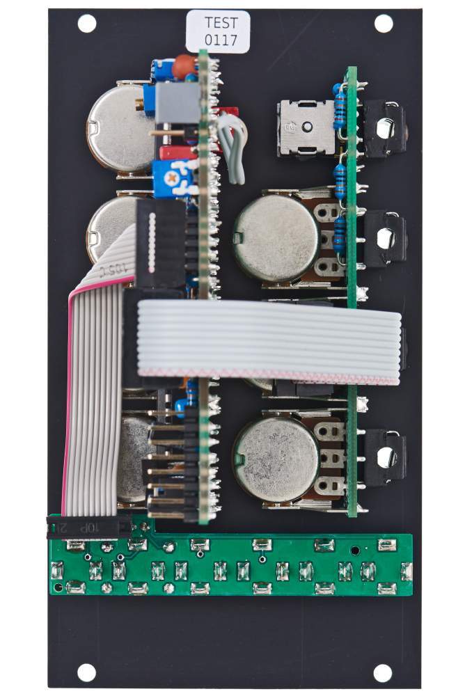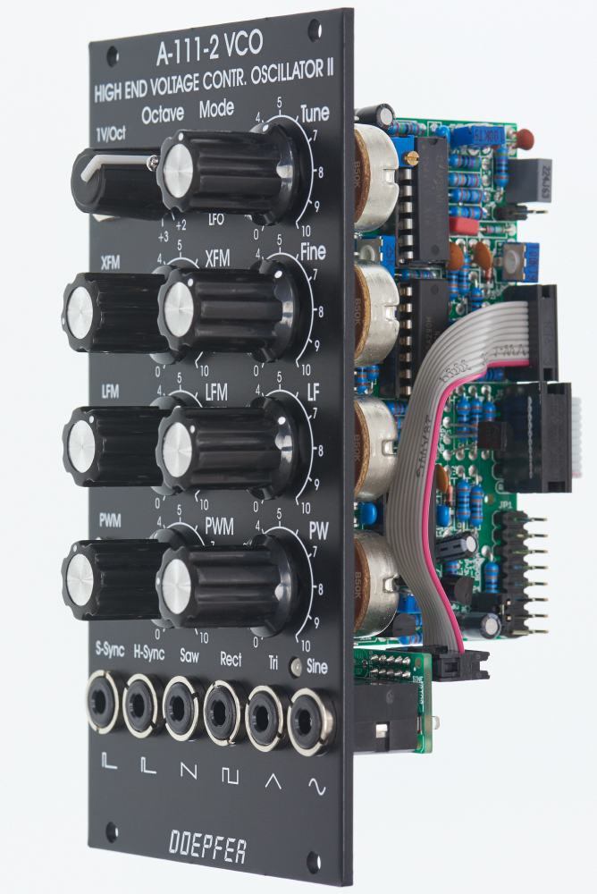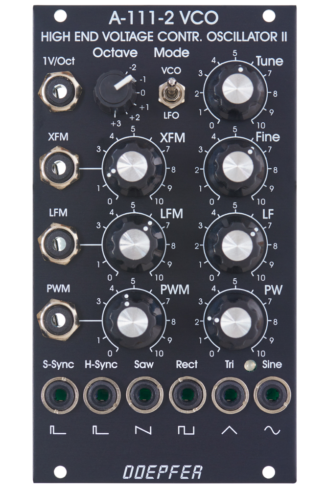 Der Oszillator hat einen Frequenzumfang von mindestens fünfzehn Oktaven (0,0001 - 40 Hz im LFO-Modus, 0,5 Hz - 20 kHz im VCO-Modus) und bietet perfektes 1V/Oktave-Tracking über mindestens zehn Oktaven, typischerweise im Bereich von 20 Hz bis 20 kHz. Frequenzen unter 25 Hz werden mit einer Zweifarb-LED optisch dargestellt. Ein 1V/Oktave-Eingang ohne Abschwächer wird ergänzt von zwei regelbaren FM-Eingängen, einem für lineare und einem für exponentielle Frequenzmodulation. Mittels eines Jumpers kann bestimmt werden, ob das Modul die Tonhöhen-CV auch über den internen CV-Bus beziehen soll. Der VCO hat einen Dreieck-Kern, aus dem Sägezahn, Puls und Sinus erzeugt werden. Die Wellenformen sind nahezu perfekt und ohne Störimpulse. Die Breite des Pulses kann mit einem Regler von 0% bis 100% eingestellt und natürlich auf moduliert werden.