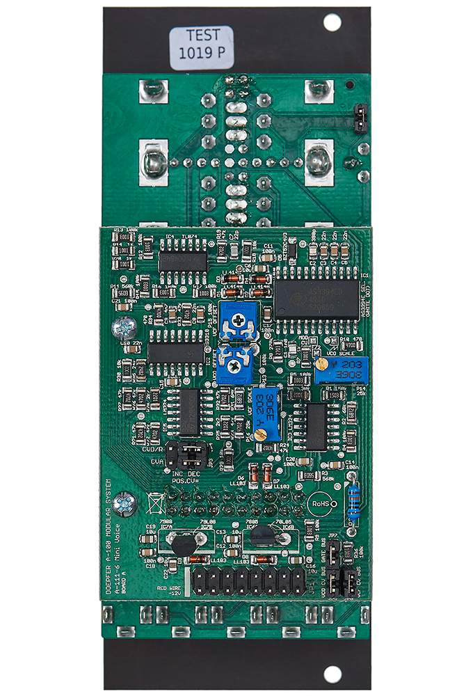 • CV-Zeit-Steuereingang CVT, mit Hilfe von zwei internen Steckbrücken (Jumpern) kann festgelegt werden, welche der Zeitparameter über VCT gesteuert werden und in welcher Richtung die Steuerung erfolgt
