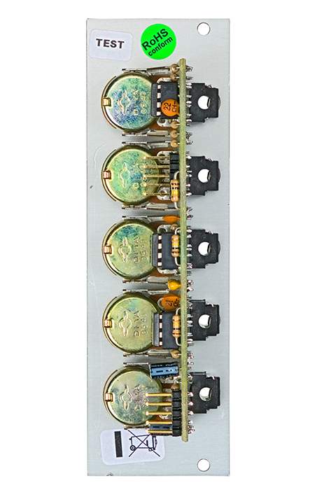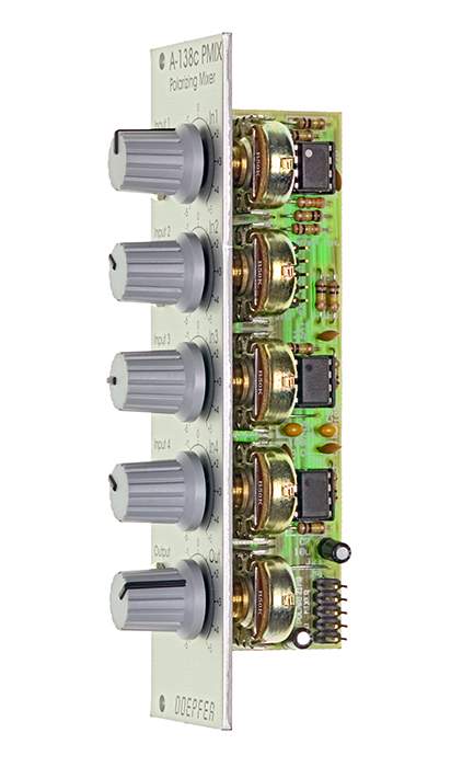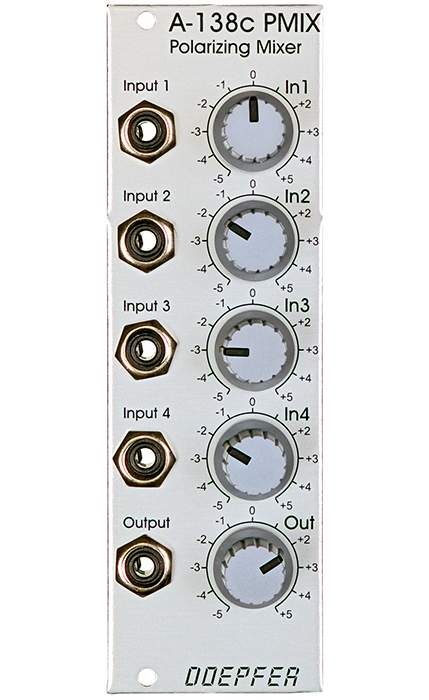 Beim Modul A-138c handelt es sich um einen vierkanaligen Mischer, der die an den Eingängen anliegenden Spannungen sowohl positiv, wie auch negativ dem Ausgangssignal hinzumischen kann (negativ hinzumischen ist dabei gleichbedeutend zu subtrahieren). In der Mittelstellung der Regler wird das Signal unterdrückt ("Nullstellung") , in der linken Position maximal vom Ausgangssignal subtrahiert, in der rechten Position maximal zum Ausgangssignal hinzuaddiert. Auch der Ausgangsregler ist in der gleichen Weise ausgeführt, d.h. das Summensignal kann selbst nochmals beliebig abgeschwächt und ggf. invertiert werden. In erster Linie ist das Modul zum Addieren bzw. Subtrahieren von Steuersignalen gedacht (z.B. ADSR, LFO). Es kann zwar auch zum Mischen von Audiosignalen verwendet werden. Hier ist der Unterschied zwischen Addition und Subtraktion jedoch nur dann von Bedeutung, wenn die Eingangssignale zueinander eine starre Phasenlage besitzen (z.B. die Ausgänge eines VCOs oder Ein- und Ausgangssignal eines Filters). Bei Audio-Signalen ohne Phasenkorrelation ist zwischen Addition und Subtraktion kein Unterschied. Eingang 1 arbeitet als Gleichspannungs-Offset-Generator (ca. -5V...+5V), solange kein Patchkabel in die Buchse Input 1 gesteckt wird. Falls diese Funktion nicht gewünscht ist, kann sie durch Abziehen eines Jumpers (Steckbrücke) auf der Platine deaktiviert werden.