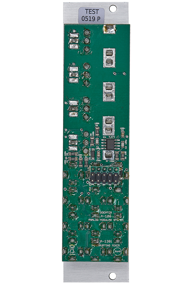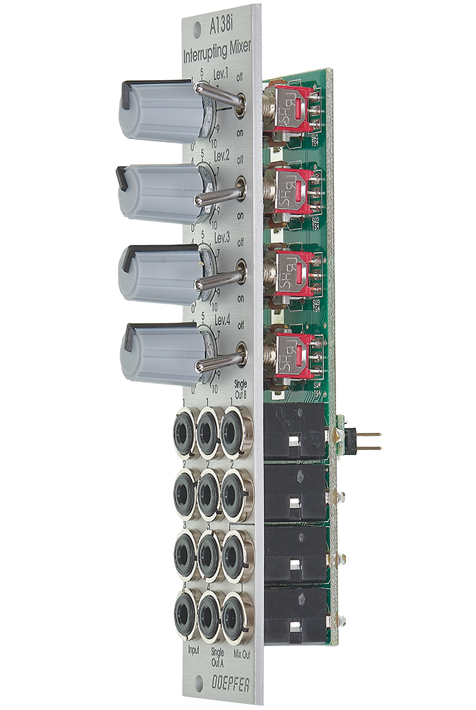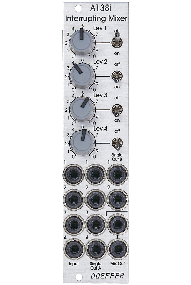 Das Modul A-138i ist ein vierkanaliger Mixer, der als Besonderheit mit einem Mute-Schalter für jeden Kanal ausgestattet ist. Zusätzlich verfügt das Modul auch über zwei Arten von Einzelausgängen und einen doppelten Mix-Ausgang. Alle Ein- und Ausgänge sind gleichspannungsgekoppelt. Daher ist das Modul sowohl zum Mischen Audio-Signalen wie auch Steuerspannungen geeignet. Für jeden der vier Eingänge steht zusätzlich zum Mute-Schalter ein Abschwächer zur Verfügung. An den Einzelausgängen steht das abgeschwächte und ggf. geschaltete Signal des betreffenden Kanals zur Verfügung. Zwei Arten von Einzelausgängen sind vorhanden: