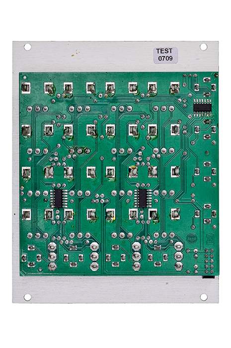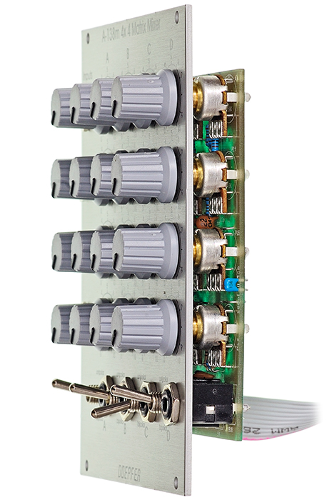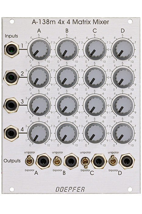 Unipolar bedeutet, dass die Regler als Abschwächer arbeitet, bipolar bedeutet, dass die Regler als Polarizer arbeiten (d.h. Invertierung des Signals links von der Mittelstellung, Mittelstellung = Null, normale Abschwächer-Funktion rechts von der Mittelstellung), da das Modul gleichspannungsgekoppelt ist, kann es sowohl für Steuerspannungen (LFO, ADSR, Random etc.) wie auch für Audio verwendet werden. Mit Hilfe eines Jumpers kann festgelegt werden, ob die Regler der oberen Reihe Gleichspannungen erzeugen ("Offset-Generatoren"), wenn in die oberste Eingangsbuchse kein Kabel eingesteckt ist. Die Funktion ist identisch zu der bei A-138a/b. Wenn dieser Jumper gesetzt ist, erzeugen die Regler der obere Reihe Gleichspannungen. Wenn diese Funktion nicht gewünscht wird, muss der Jumper am oberen, linken Rand der Leiterplatte entfernt werden.