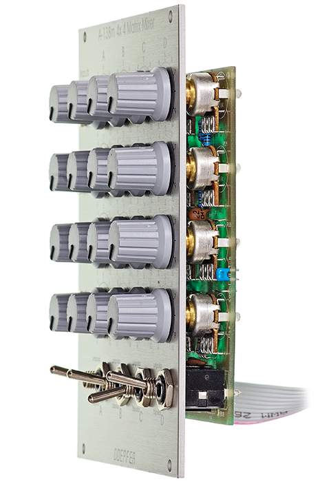 Matrix-Mixer mit vier Reihen (1 - 4) und vier Spalten (A - D), Schalter für unipolaren/ bipolaren Modus pro Spalt.