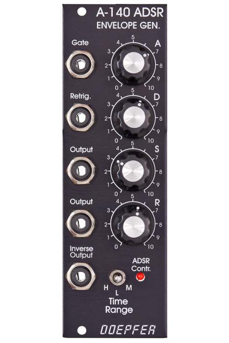 Sobald der ADSR am Gate-Eingang getriggert wird, generiert er einen einstellbaren Steuerspannungsverlauf, die Hüllkurve. Diese steht an seinen Ausgängen in normaler und invertierter Form zur Verfügung und kann z.B. zur Modulation der Module VCO, VCF und VCA sowie für Ein- und Ausschwingvorgänge anderer Module verwendet werden. Die Form der Hüllkurve ist durch die vier Parameter Attack, Decay, Sustain und Release eindeutig beschrieben. Getriggert wird der ADSR durch ein Gate-Signal am Gate-Eingang. Der ADSR bietet die Möglichkeit einer Retrigger-Funktion, d.h. die Hüllkurve wird jedesmal neu gestartet, sobald ein Trigger-Signal an der Retrigger-Buchse anliegt während Gate aktiv ist. Das Modul verfügt über einen Kippschalter mit drei Stellungen, um einen von drei Zeitbereichen anzuwählen. Die Hüllkurvendauer kann im Bereich von ca. 50us (Microsekunden) bis hin zu mehreren Minuten eingestellt werden.