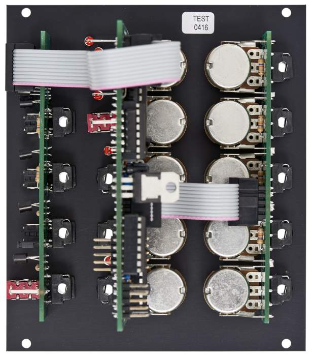 Einbau des A-154: Die Funktionen der Start/Stop/Step/Reset-Taster und -Eingänge sind die gleichen wie beim A-155. Der A-154 wird verwendet um die "alte" Steuereinheit eines oder mehrerer A-155 zu ersetzen. Wird ein A-154 zur Steuerung eines A-155 verwendet, so wird über die A-154 Master-Funktion (Schalter und Gate-Steuereingang) am A-154 gewählt, ob die "alte" Steuereinheit des A-155 benutzt wird oder diese ausser Funktion gesetzt und stattdessen die Steuerung vom A-154 übernommen wird. Die 10-polige Steckverbindung vom A-155 muss hierzu beim Einbau des A-154 auf den A-154 umgesteckt werden und die neue Steuerung auf den A-155 aufgesteckt werden. Der A-154 muss daher möglichst direkt rechts neben dem A-155 angeordnet werden. Bei zwei A-155 müssen die beiden A-155 untereinander und der A-154 neben dem oberen oder unteren A-155 montiert werden. Werden zwei A-155 eingesetzt, so können diese parallel (8 Stufen) oder seriell (16 Stufen) betrieben werden. Der 8/16 Schalter am A-154 legt dabei fest, ob der "8 Step Mode" (zwei A-155 parallel) oder der "16 Step Mode" (zwei A-155 seriell) gewählt wird. Beide Betriebsarten funktionieren auch mit spannungsgesteuerter Adressierung. Im "8 Step Modus" werden nur die Stufen 1...8 adressiert, im "16 Step Modus" die Stufen 1...16. Achtung! Bei zwei A-155 entfällt beim zweiten A-155 die Möglichkeit, auf die "alte" Controller-Einheit umzuschalten. In diesem Fall werden beide A-155 vom A-154 oder von der "alten" Controller-Einheit des ersten A-155 gesteuert (je nach Position des Master-Schalters am A-154).