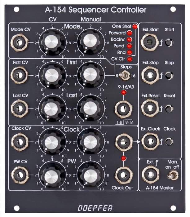 Der A-154 ersetzt die bisherige Steuereinheit des A-155 (d.h. der Bereich der A-155-Frontplatte mit Start / Stop / Step / Reset-Tastern und -Eingängen).