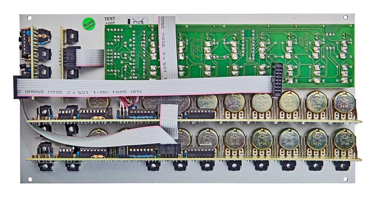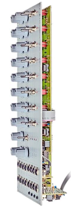 - bei der unteren Reihe: 8 externe Eingänge für die 8 Stufen (Schaltbuchsen), hier können sowohl Steuersignale wie auch Audio-Signale im Bereich -5V ... +12V eingespeist werden, die zugehörigen Potis arbeiten dann als Abschwächer.