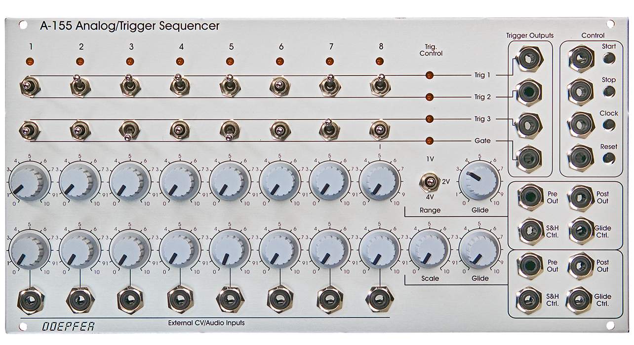 Mit Hilfe des Sequencer-Controllers A-154 können die Funktionen des A-155 ganz erheblich erweitert werden (z.B. spannungsgesteuerte Step-Adressierung, vorwärts/rückwärts/pendeln/zufälliger Betrieb, Spannungssteuerung von erstem und letztem Schritt, Spannungssteuerung von Tempo und Gate-Länge, Überspringen von Schritten, Kombination mehrerer A-155 bei parallelem oder seriellem Betrieb und vieles mehr).