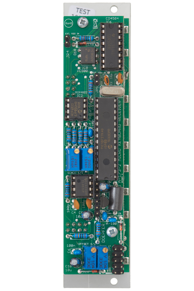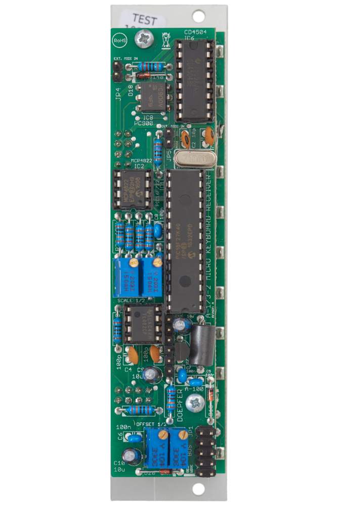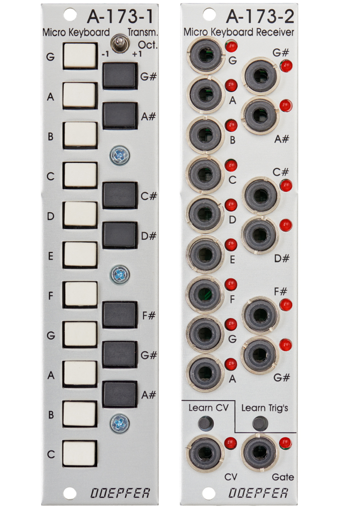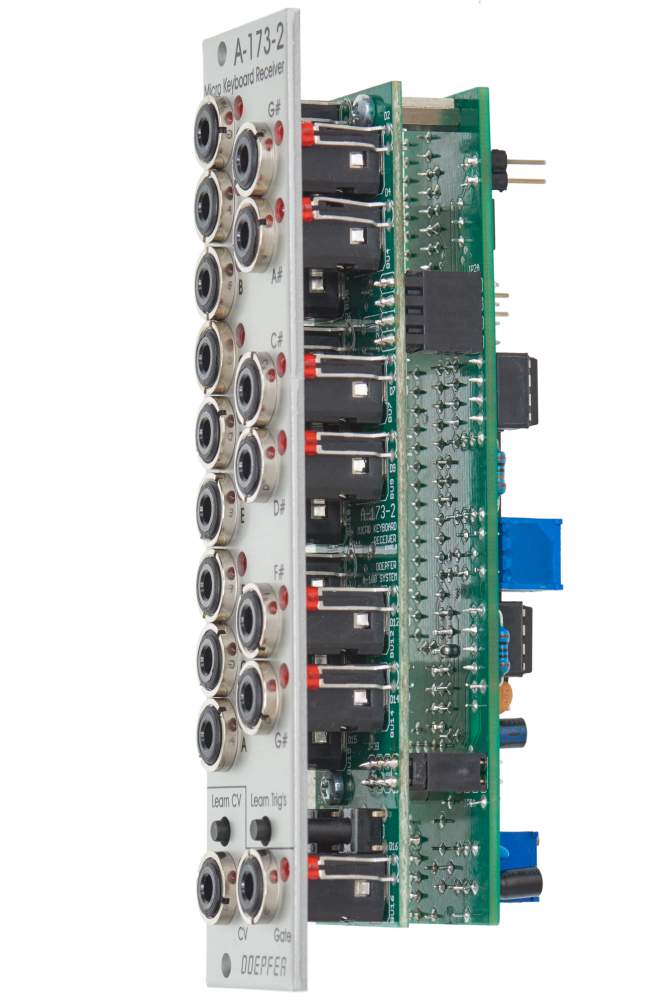 A-173-2 ist die Empfangseinheit hierzu und übernimmt 2 Funktionen: erstens stehen 15 Gate-Ausgänge zur Verfügung, die den ersten 15 Tasten des Mini-Keyboards fest zugeordnet sind. Jeder Gate-Ausgang kann im Wechselmodus oder im Normalmodus arbeiten. Die Gate-Zustände werden mit 15 LEDs angezeigt. Zum zweiten erzeugt das Modul eine CVSteuerspannung, die dem 1V/Oktave-Standard folgt, sowie das zugehörige (globale) Gate-Signal. Um eine Abtrennung einzelner Gate-Signale von der CV-Einheit zu ermöglichen, besitzt das Module A-173-2 eine Art Splitfunktion. So kann man beispielsweise festlegen, dass die ersten 5 Tasten des Steuerkeyboards nur die ersten 5 Gate-Ausgänge steuert, auf die CV-Einheit aber keinen Einfluss hat. Auf diese Weise kann man auch mehrere Gate-Signale und steuern, ohne die CV-Einheit zu beeinflussen.