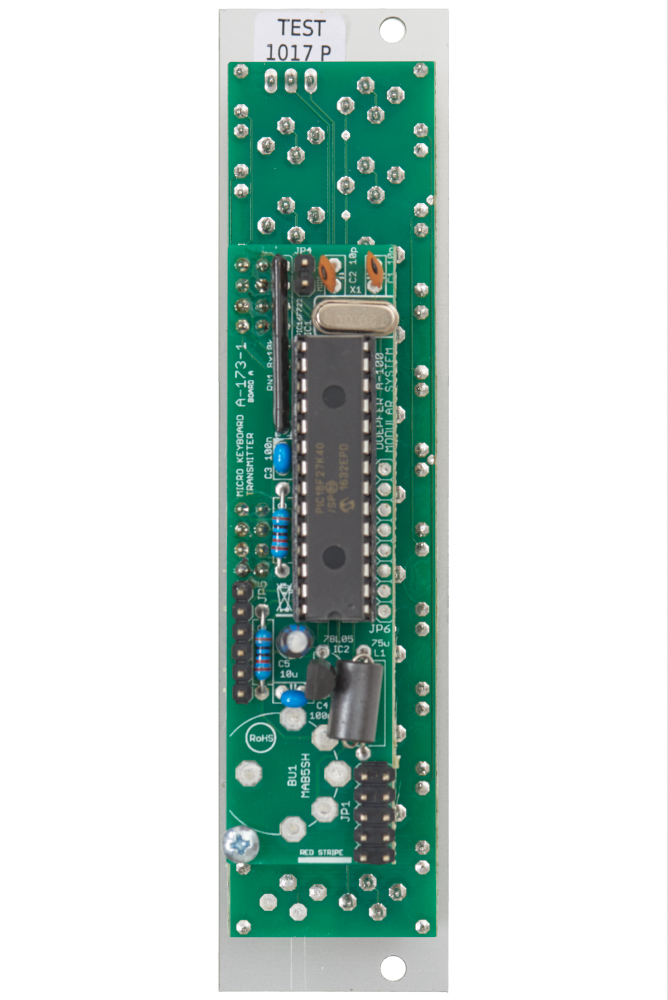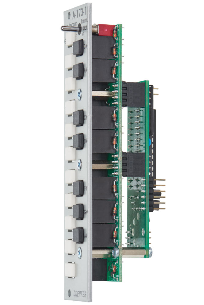 A-173-1 ist ein Miniatur-Keyboard mit 1 1/2 Oktaven, wobei die Tasten vertikal übereinander angeordnet sind. Über einen Oktavschalter kann das Keyboard um eine Oktave nach oben oder unten transponiert werden.