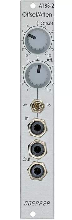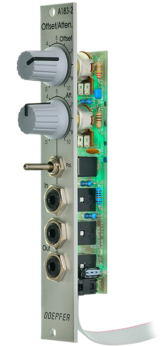 Das Modul A-183-2 ist ein Spannungs-Offset-Generator kombiniert mit einem Abschwächer/Polarizer. Mit einem Schalter wird zwischen Abschwächer- und Polarizer-Betrieb umgeschaltet. Am Ausgang erscheint eine Gleichspannung, die mit dem Offset-Regler im Bereich 0...+5V oder –5V...+5V eingestellt werden kann (Bereich mit einem Jumper wählbar). Dieser Gleichspannung wird das abgeschwächte und ggf. invertierte Eingangssignal (Polarizer-Modus) hinzuaddiert.