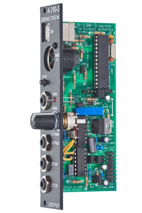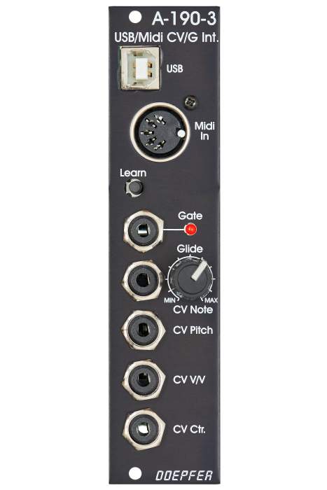 Beim Modul A-190-3 handelt es sich um ein USB/Midi-to-CV/Gate-Interface, das die Einbindung des Modulsystems A-100 in eine USB- oder Midi-Umgebung ermöglicht. Das Modul liefert 4 analoge Steuerspannungen (CV1...4) und ein Gate-Signal. Es handelt sich um die Modulversion von Dark Link.