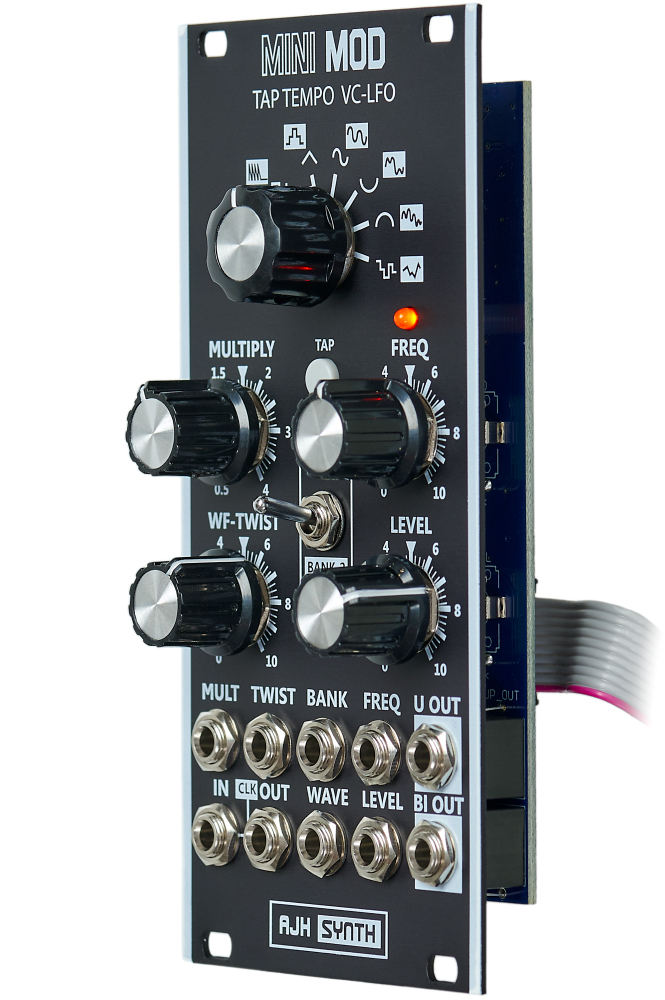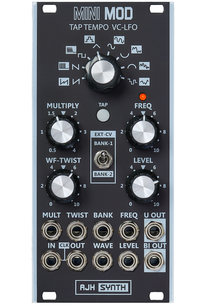 Der MiniMod Tap Tempo VC-LFO ist ein 12HP breiter LFO mit einer Vielzahl nützlicher Funktionen wie Tap Tempo und interner/externer Clock-Steuerung.