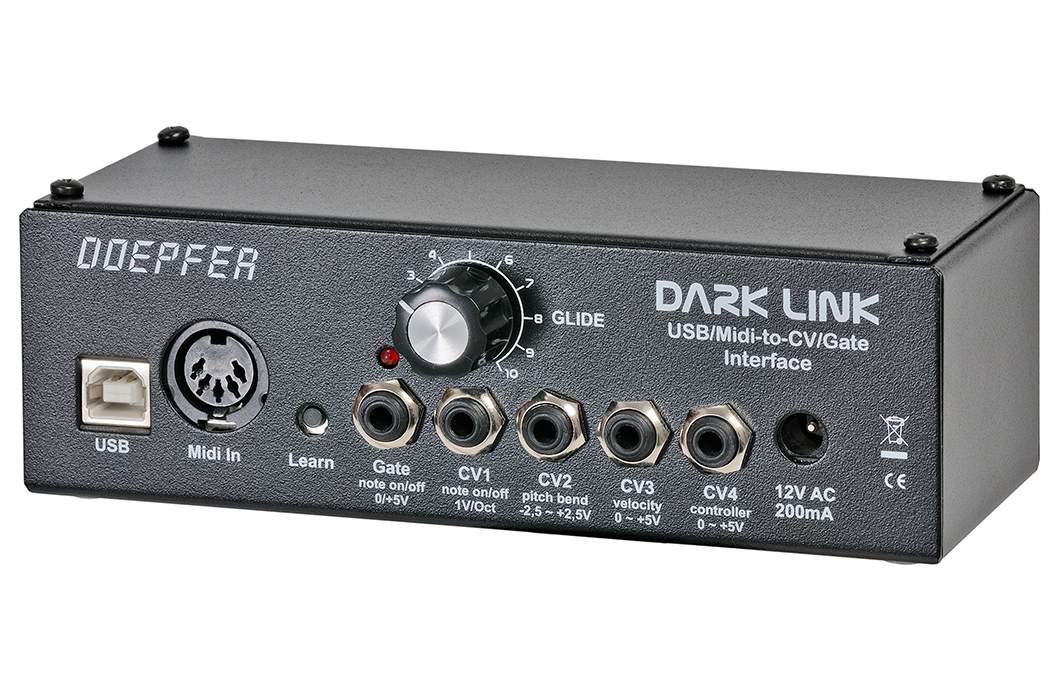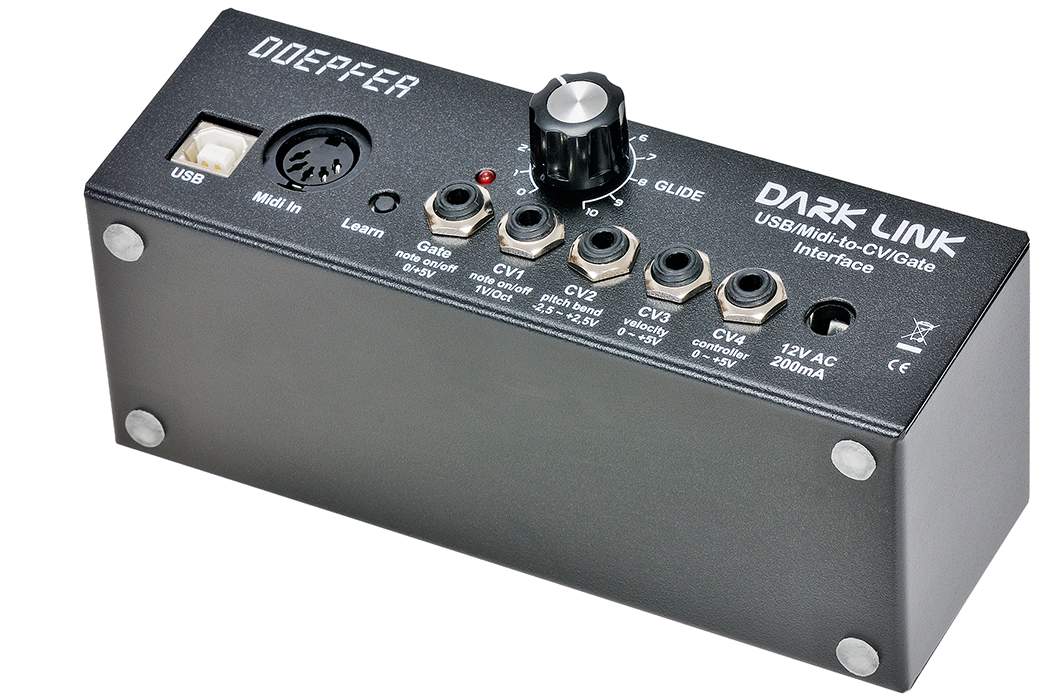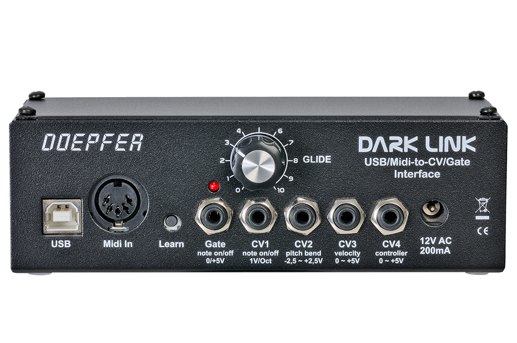 Dark Link ist baugleich zum USB/Midi-Interface aus dem Dark Energy. Das Gerät liefert 4 analoge Steuerspannungen (CV1...4) und ein Gate-Signal.