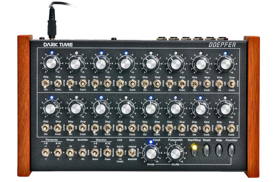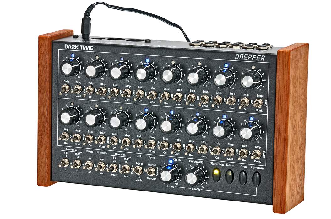 Dark Time ist ein 2 x 8-stufiger Analogsequenzer mit CV/Gate, USB und Midi-Interface. Er ist in erster Linie als Ergänzung zum Dark Energy gedacht, kann aber auch mit anderen Geräten kombiniert werden.