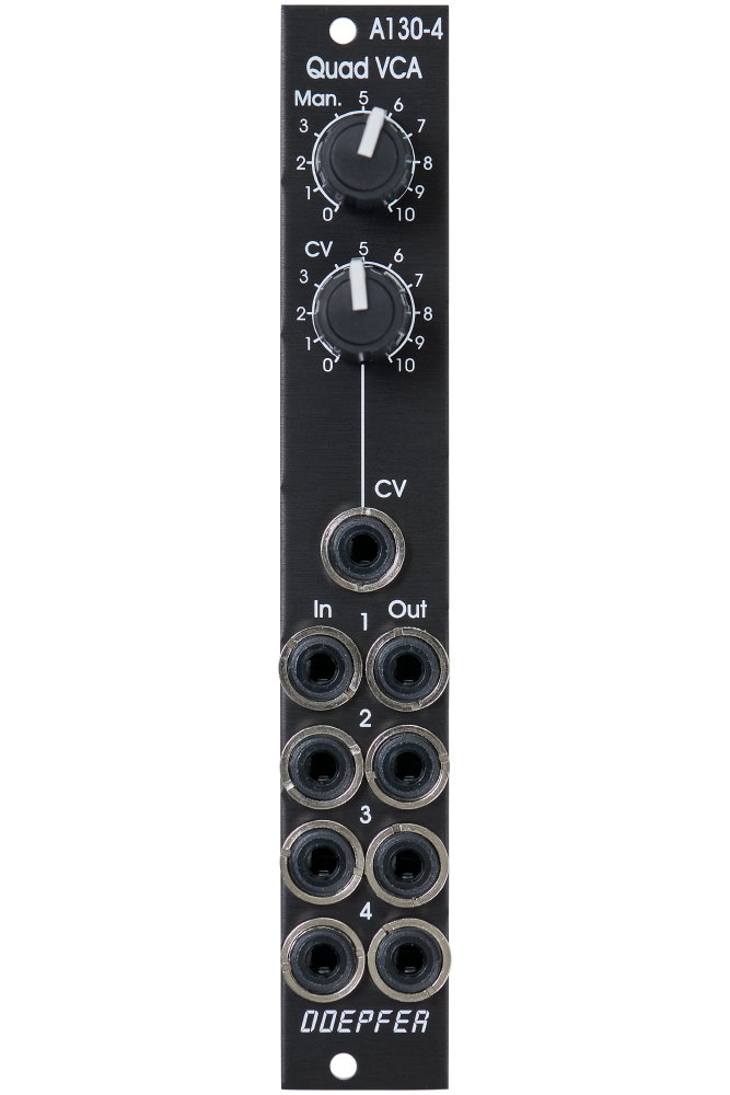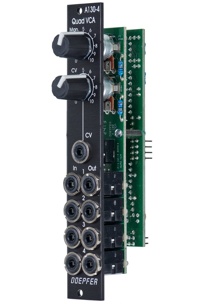 Das Modul A-130-4V beinhaltet vier lineare VCAs (spannungsgesteuerte Verstärker) die eine gemeinsame Steuereinheit besitzen. Es kann für die gleichzeitige Pegel-Änderung von bis zu 4 Audio- oder Steuersignalen eingesetzt werden. Der A-130-4 ist der Nachfolger des nicht mehr erhältlichen Moduls A-132-2. Gegenüber dem A-132-2 wurde jedoch die Größe halbiert (4TE statt 8TE).
