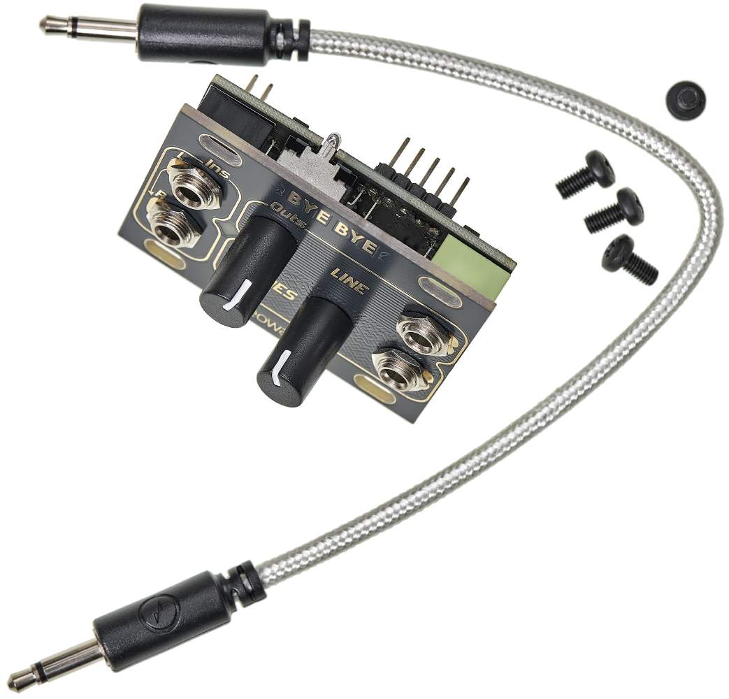 Bye Bye ist ein einfacher, aber praktischer analoger Line- und Phone-Stereo-Ausgang. Er verfügt über eine Steckverbindung auf der Rückseite zum Anschluss des Supamix sowie eine LED-Anzeige für Clipping.