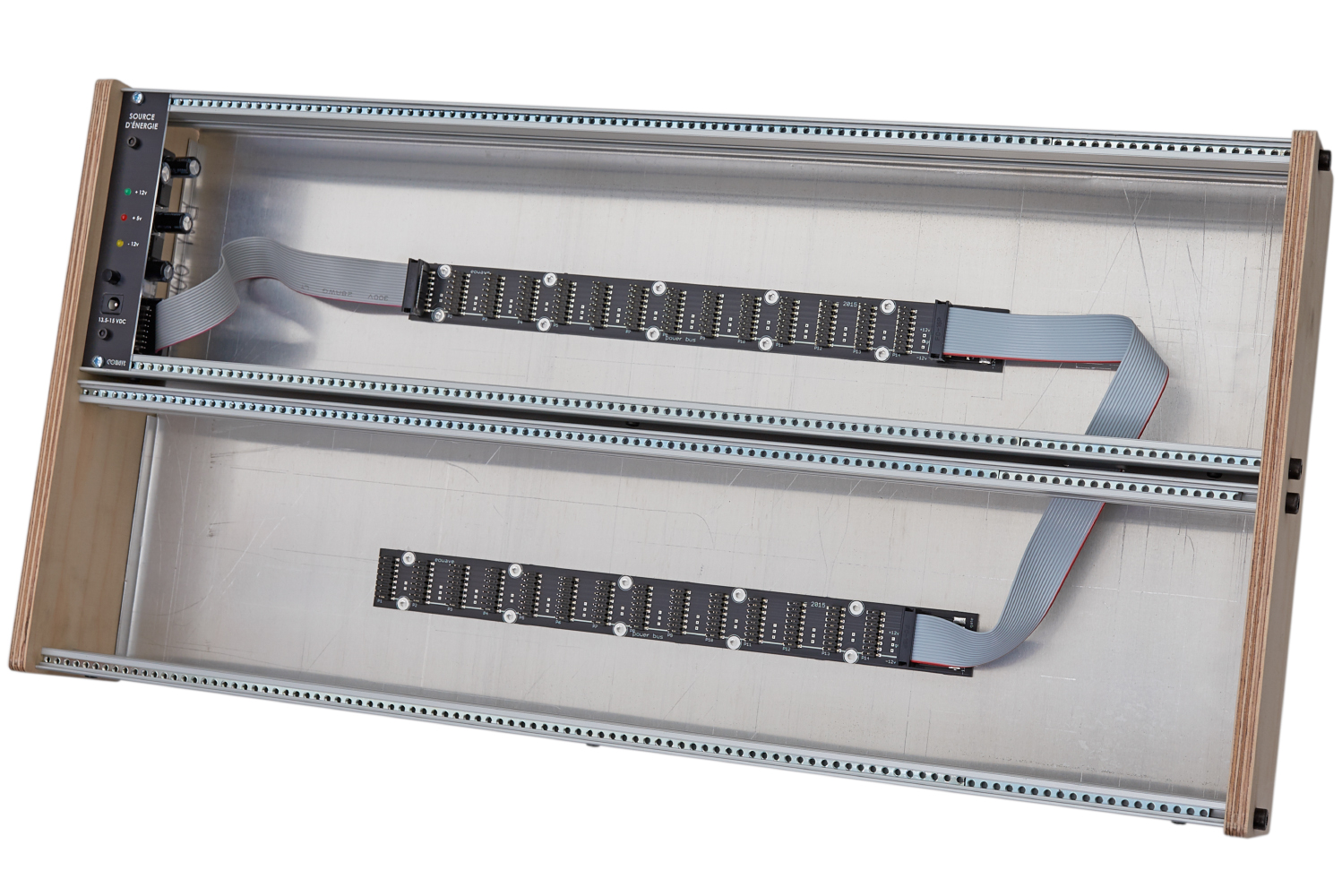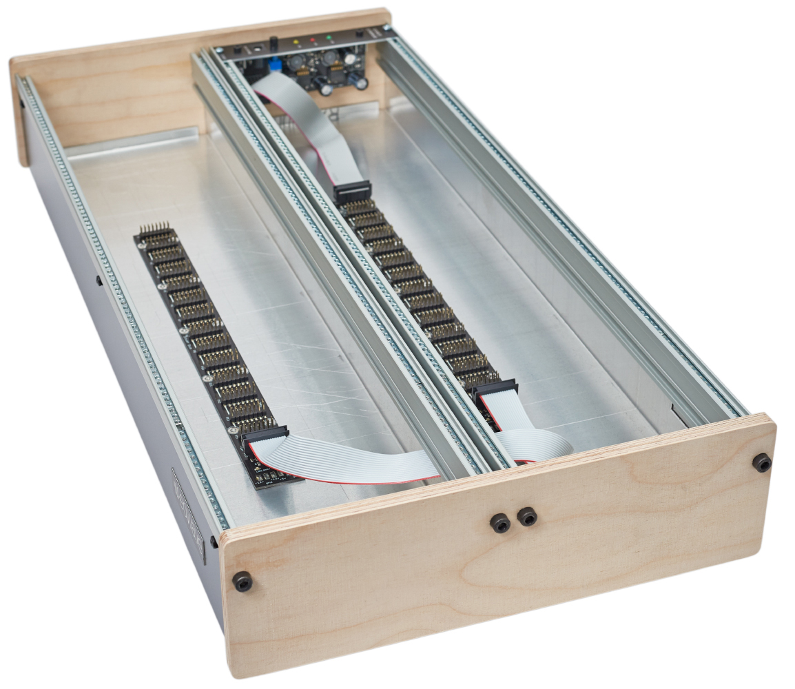 Preiswertes flaches 2x 104TE Case mit Multiplex-Seitenteilen, inklusive Stromversorgung +/- 12V (je 1,5A) und +5V (0,5A), das Spannungsversorgungsmodul beansprucht 4TE. Maximale Einbautiefe für Module: 5,4cm. Formschön und preiswert.