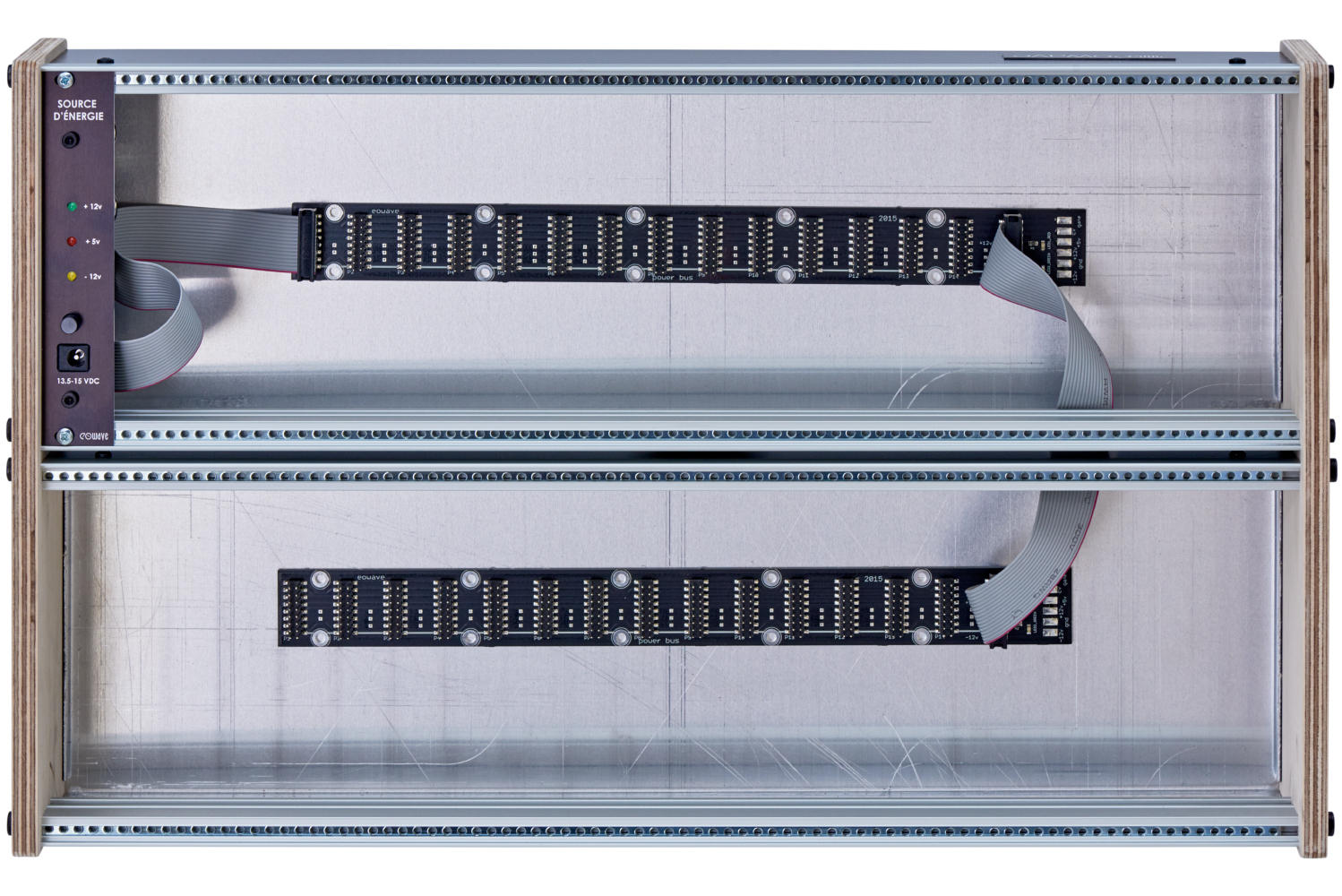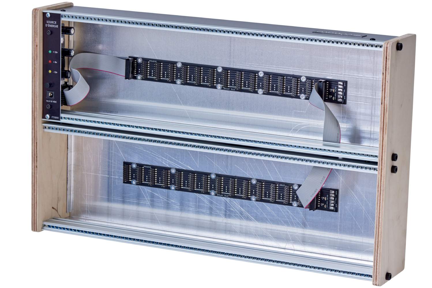 Preiswertes flaches 2x 84TE Case mit Multiplex-Seitenteilen, inklusive Stromversorgung +/- 12V (je 1,5A) und +5V (0,5A), das Spannungsversorgungsmodul beansprucht 4TE. Maximale Einbautiefe für Module: 5,4cm. Formschön und preiswert.
