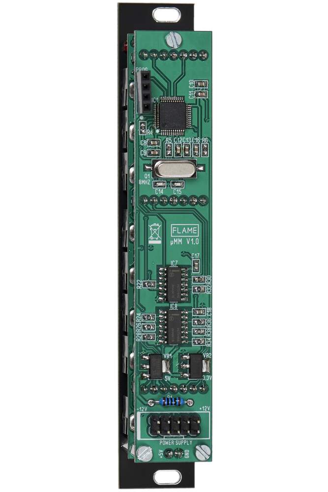 Das “uMM” vereint einen MIDI-Merger und zwei unabhängige THRU-Verteiler in einem nur 4HP schmalen Modul. Alle Buchsen des Moduls sind im MIDI-TRS-B Format ausge- führt.