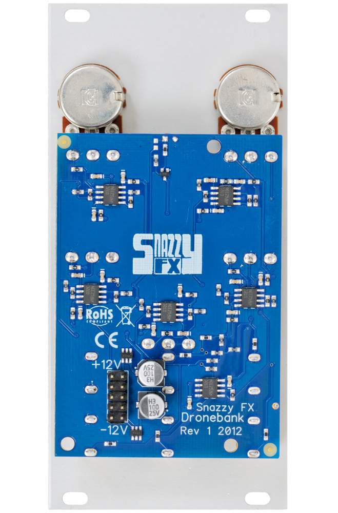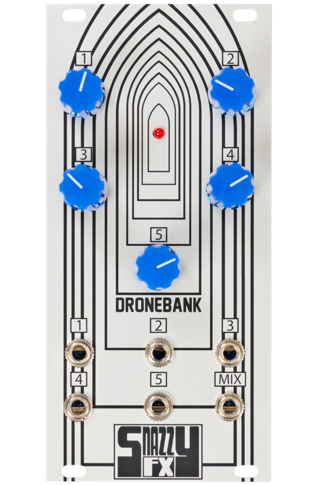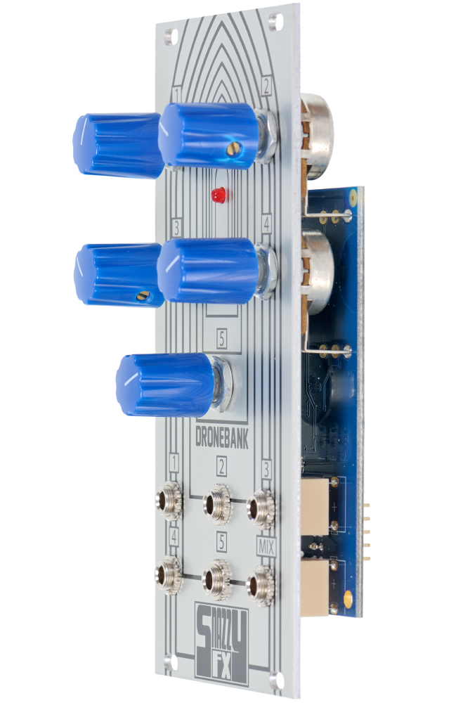 Die fünf Oszillatoren des Dronebank erzeugen eher dumpfe Klänge mit wenigen Obertönen und ihre Frequenz ist individuell regelbar. Es gibt einen Mischausgang, aber jeder Oszillator hat auch einen Einzelausgang, was in Kombination mit einem Stereo-Mixer mit einstellbarem Panorama sicherlich interessant ist.