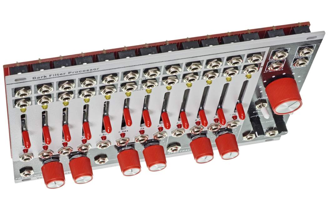 Das Bark Filter ist eine 12-bandige Festfilterbank mit spannungsgesteuertem Mischer, die zusätzlich für jedes Filter einen Envelope Follower und einen Einzelausgang besitzt.