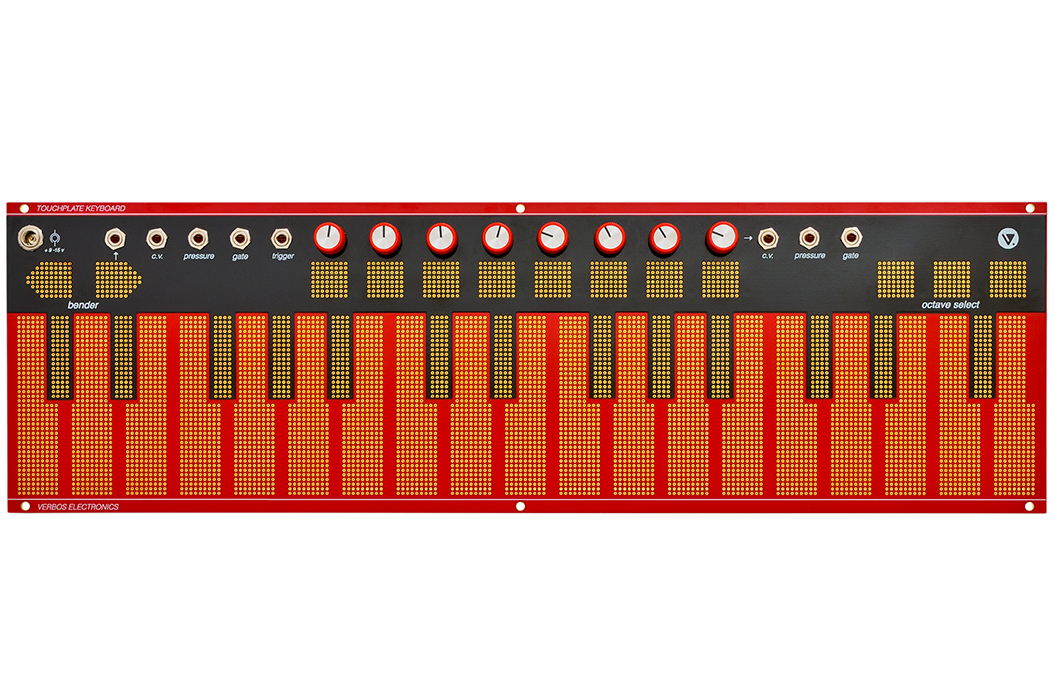 In Tradition der West Coast-Synthesizer bietet Verbos einen kapazitiven Touchplate-Controller mit drei unabhängigen Sektionen an: ein auf 1V/Oktave eingestelltes 32-Tasten-Keyboard, einen Bender und ein 8-Tasten-Keyboard mit variablen Ausgangsspannungen pro Taste.