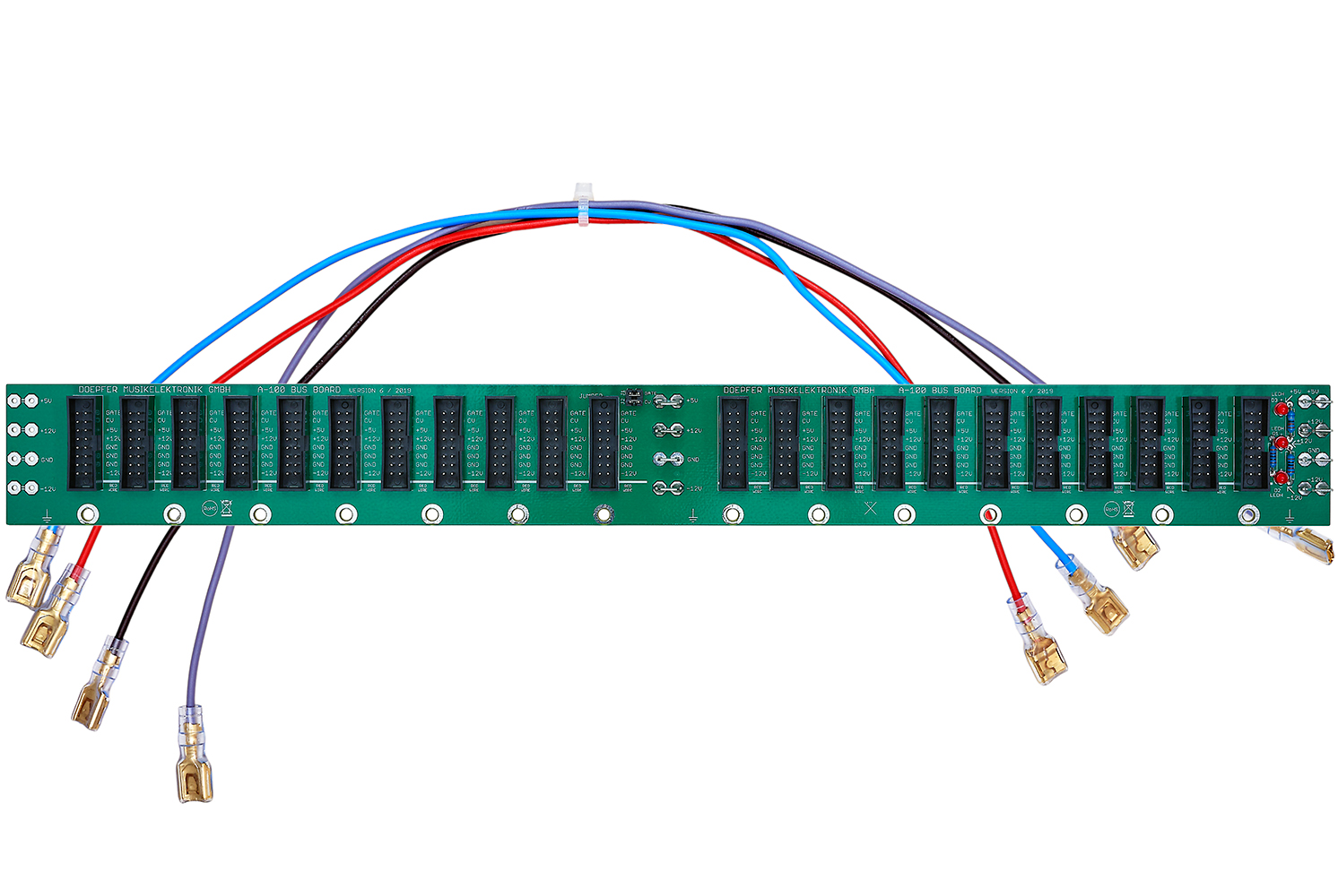 An assembled and tested bus board, 22 sockets, e.g. for customers who want to built their own case and need a bus board for A-100 modules, includes cables for connection to +/-12V power supply (4 wires with flat connectors on both ends, length about 30cm), but no mechanical parts (e.g. screws, spacers, nuts, washers).