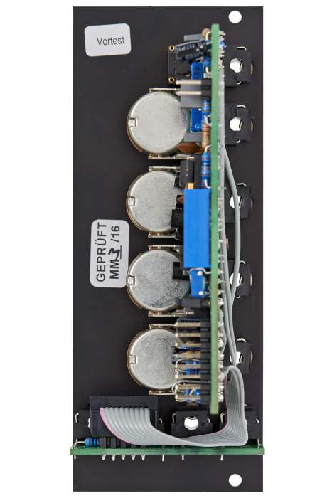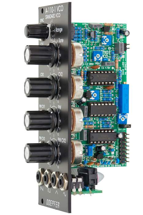 Module A-110 is a voltage-controlled oscillator. This VCO's frequency range is about eight octaves (ca. 15Hz ... 8kHz). It can produce four waveforms simultaneously: square, sawtooth, triangle, and sine wave.