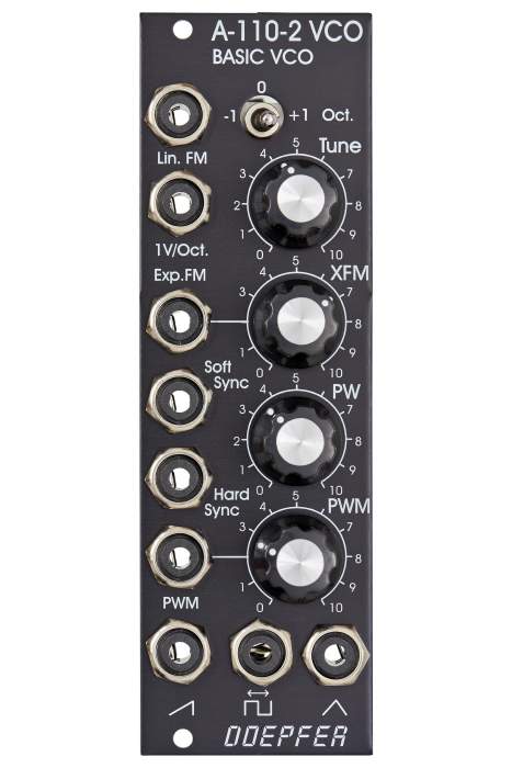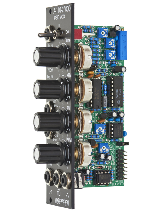 It's a slightly reduced version of the standard VCO A-110-1. Compared to the A-110-1 the A-110-2 has no sine output and the (expensive) octave rotary switch is replaced by a 3-position toggle switch. In return the A-110-2 is equipped with an additional linear FM input and a soft sync input.