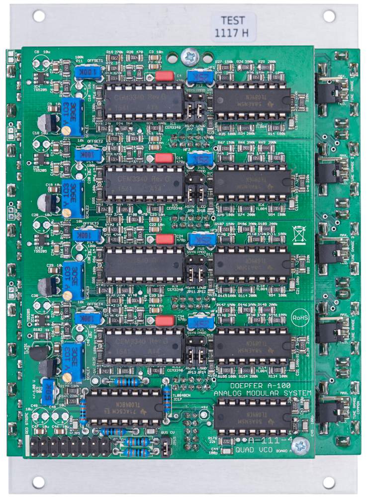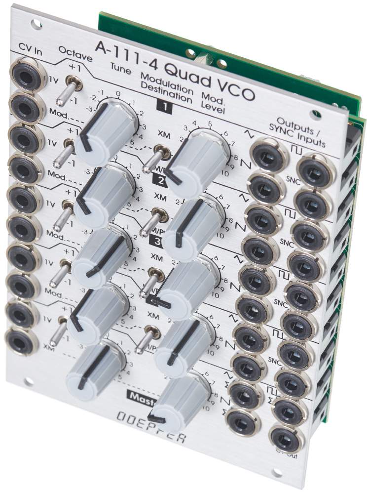 A-111-4 contains four precision VCOs and has individual controls, inputs and outputs for each VCO available as well as a common control and output unit.