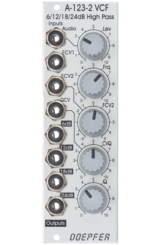 A-123-2 is a voltage controlled highpass filter with four filter outputs (6, 12, 18 and 24dB slope). It also features voltage control of the resonance.