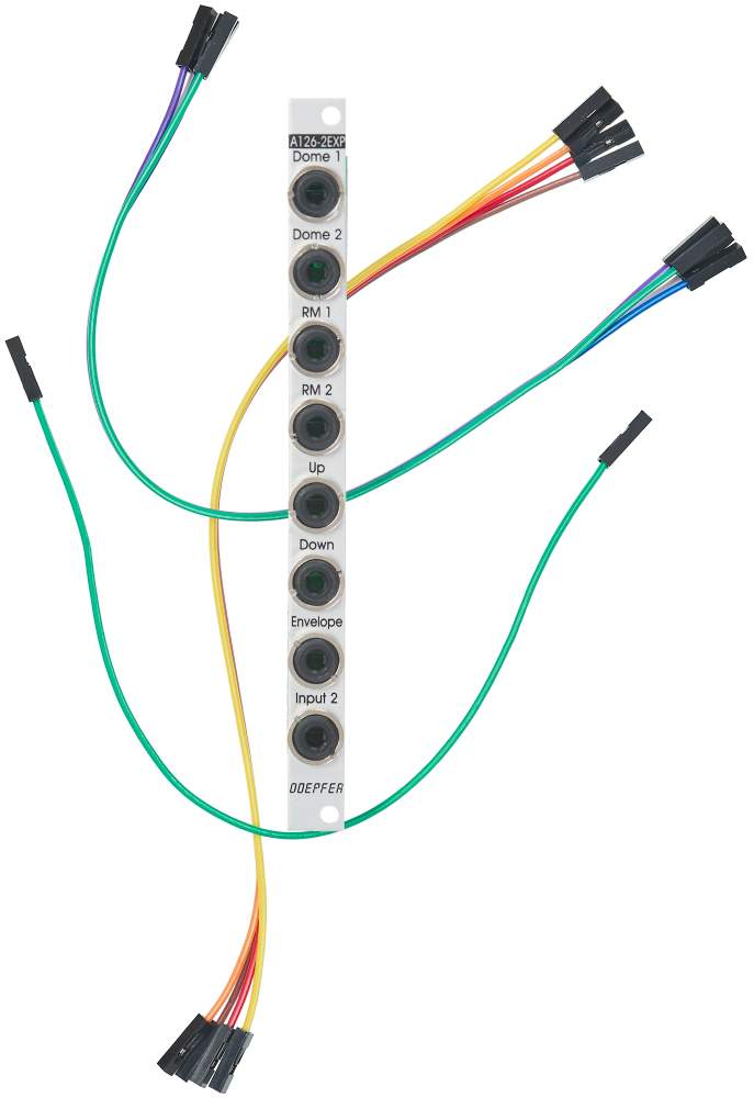 It adds two outputs from the Dome filter (+45 and -45 degrees) as well as separate outputs from the ring modulators 1 and 2, and from the internal envelope generator. Furthermore, it offers dedicated outputs for Up and Down Shift, allowing the module to be patched in stereo.